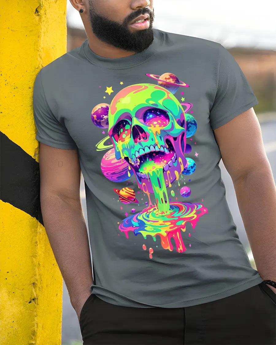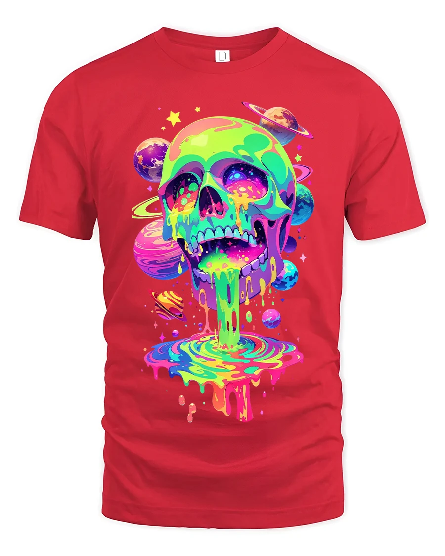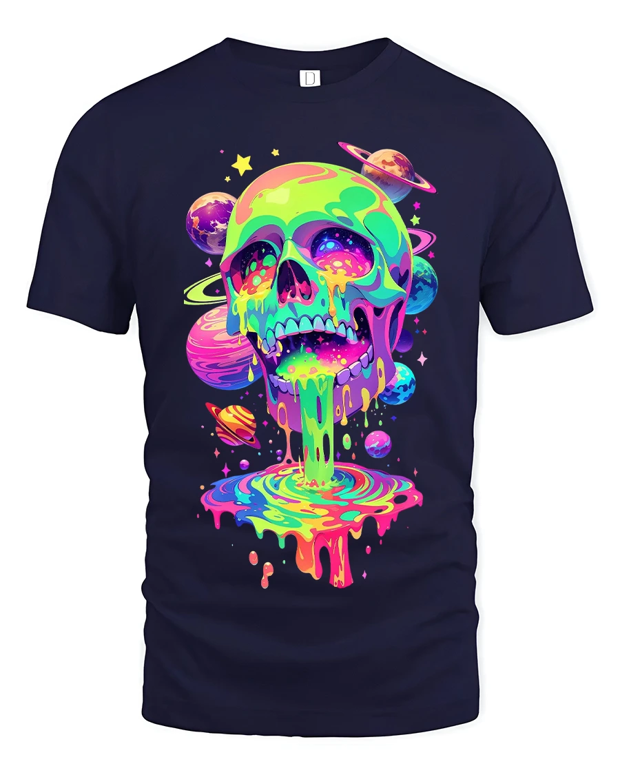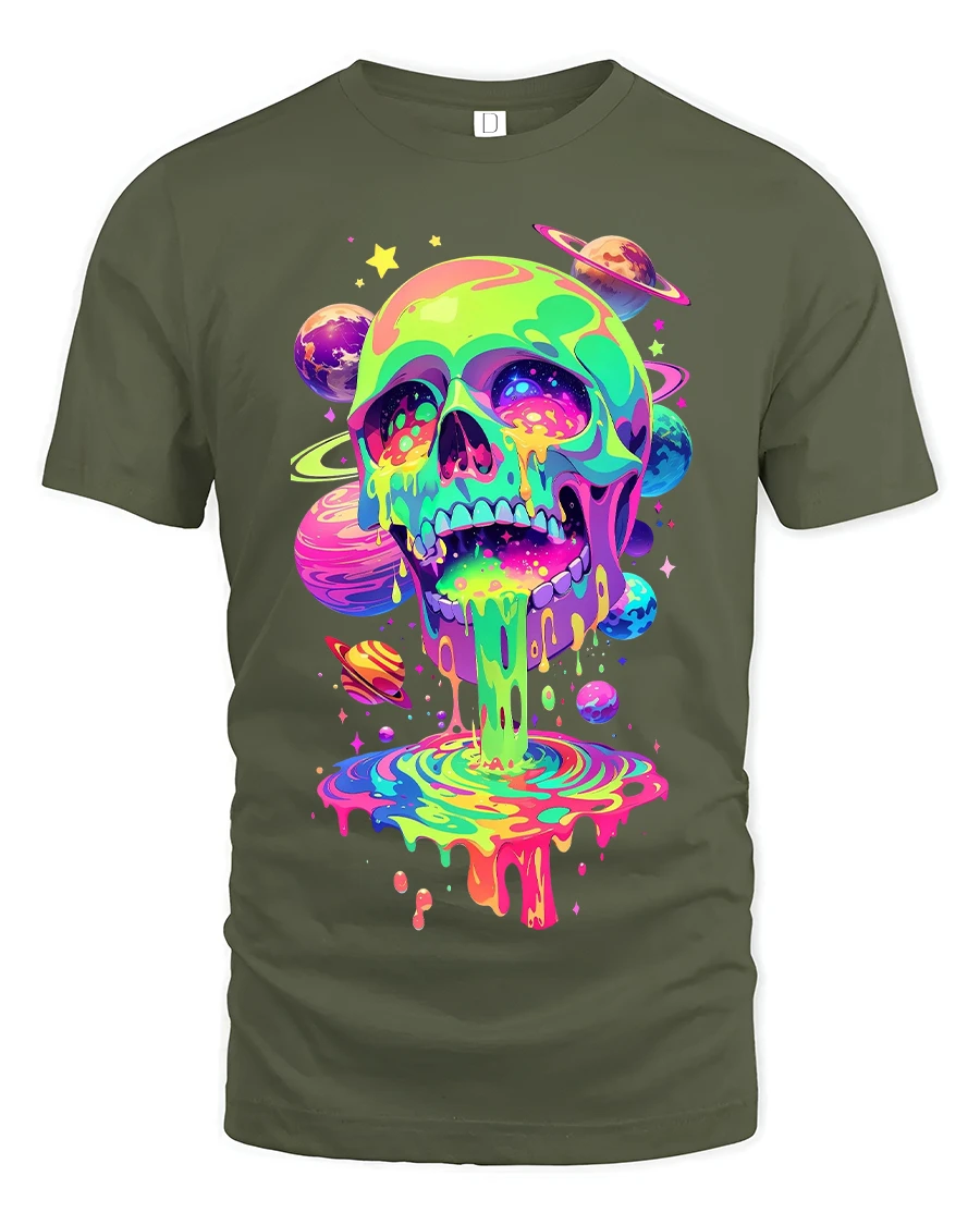 The melting skull artwork combined with planets stars and neon paint drips creates a powerful visual that feels futuristic artistic and rebellious.