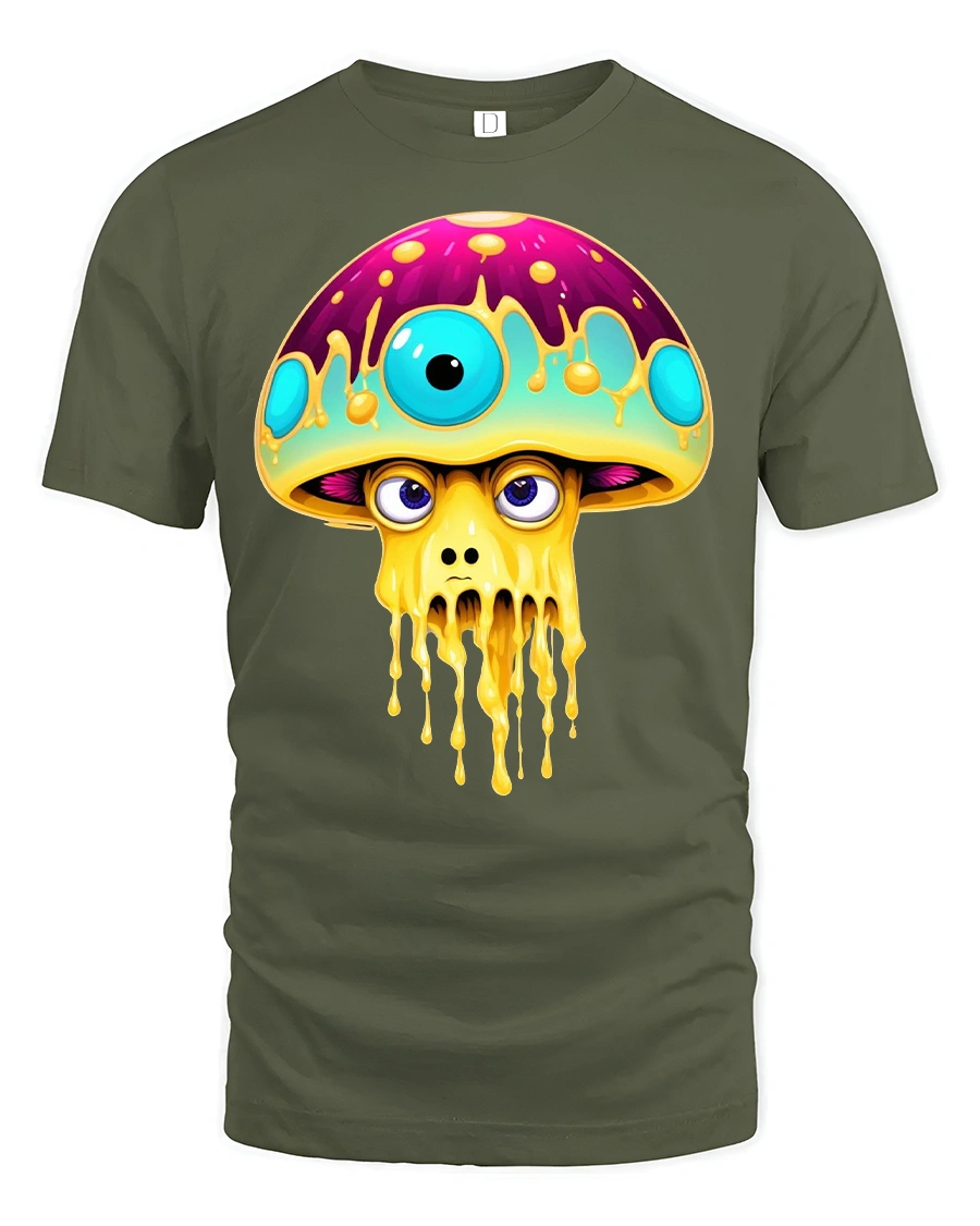 Psychedelic Drip Shroom Monster Art Tee for Trippy Style Fans - military green t-shirt on white background