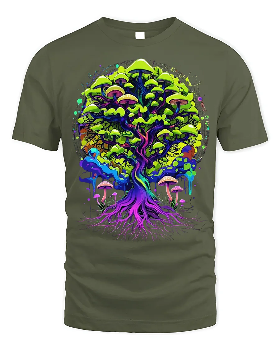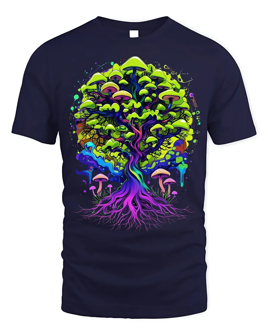 Dive into a world of vibrant imagination with our Psychedelic Mushroom Tree Tee. This eye-catching t-shirt features a fantastical tree adorned with glowing mushrooms, surrounded by dripping colors and abstract elements, evoking a truly unique and mystical vibe. It’s the perfect choice for those who love surreal art, nature-inspired designs, or stand-out festival wear.