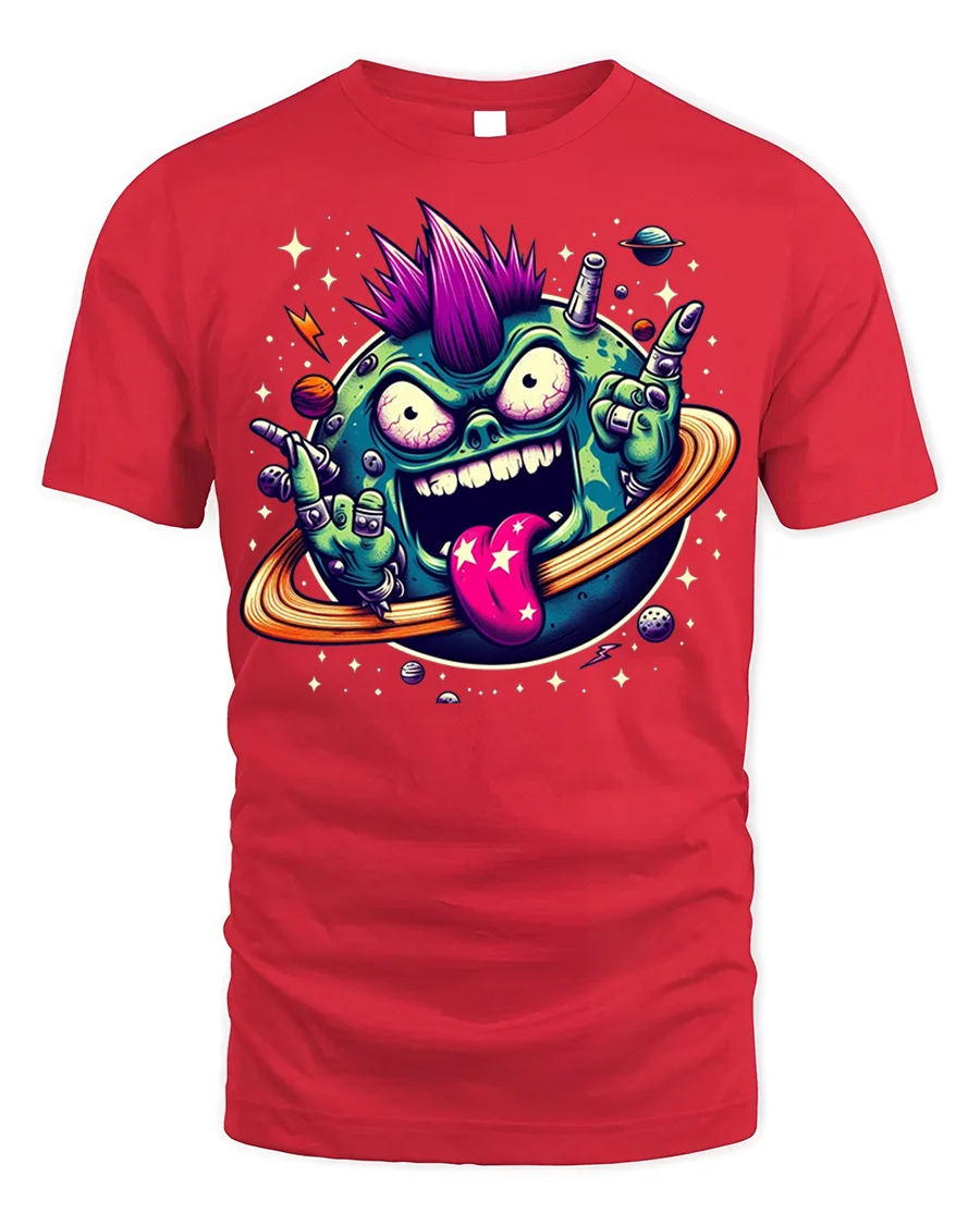 Punk Planet Cartoon T-shirt with Space Art Print - red t-shirt on white background
