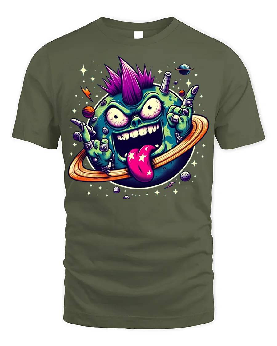Punk Planet Cartoon T-shirt with Space Art Print - military green t-shirt on white background