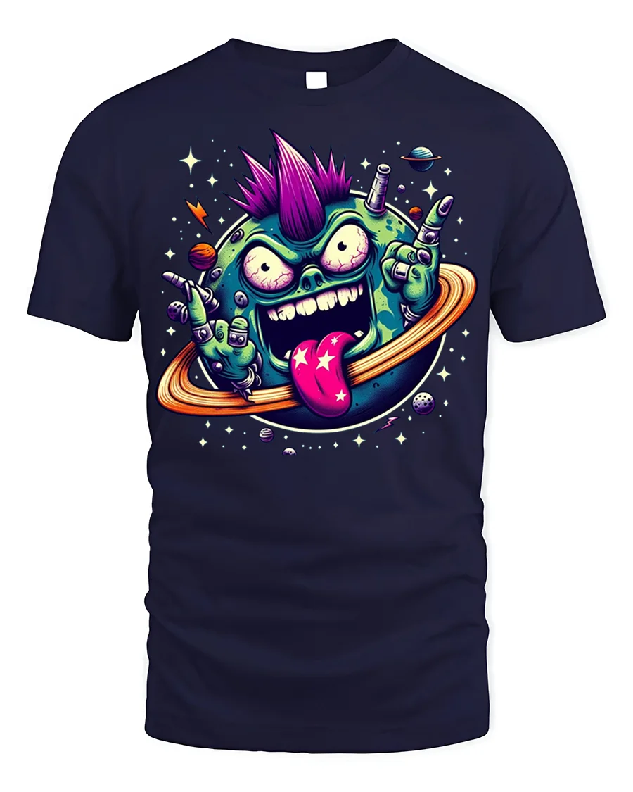 Blast off in style with the Punk Planet Cartoon T-shirt with Space Art Print, featuring a hilariously wild space character that looks like your favorite punk rocker just turned into a planet!