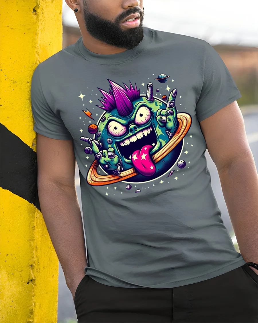 Orbiting rings and mini planets swirl around this rebellious ball of energy, making it the perfect choice for space nerds, cartoon lovers, and fans of bold graphic tees.