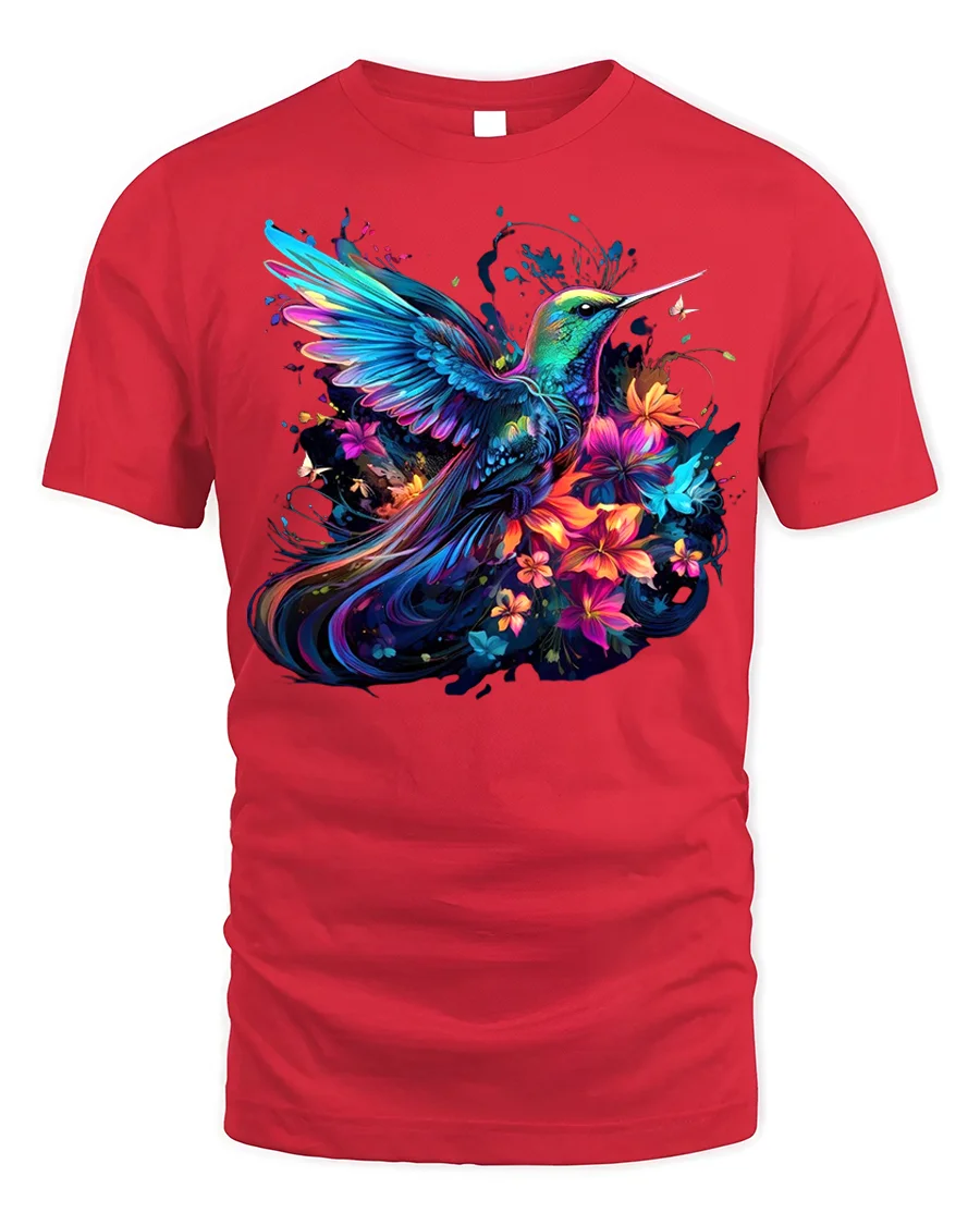 Tags: artistic bird design, beautiful hummingbird, bright floral top, colorful nature tee, comfortable t-shirt, exotic flower tee, floral tee, garden lover gift, Hummingbird t-shirt, summer bird shirt, tropical bird shirt, unique animal tee, US wildlife shirt, vibrant bird shirt, women's nature shirt