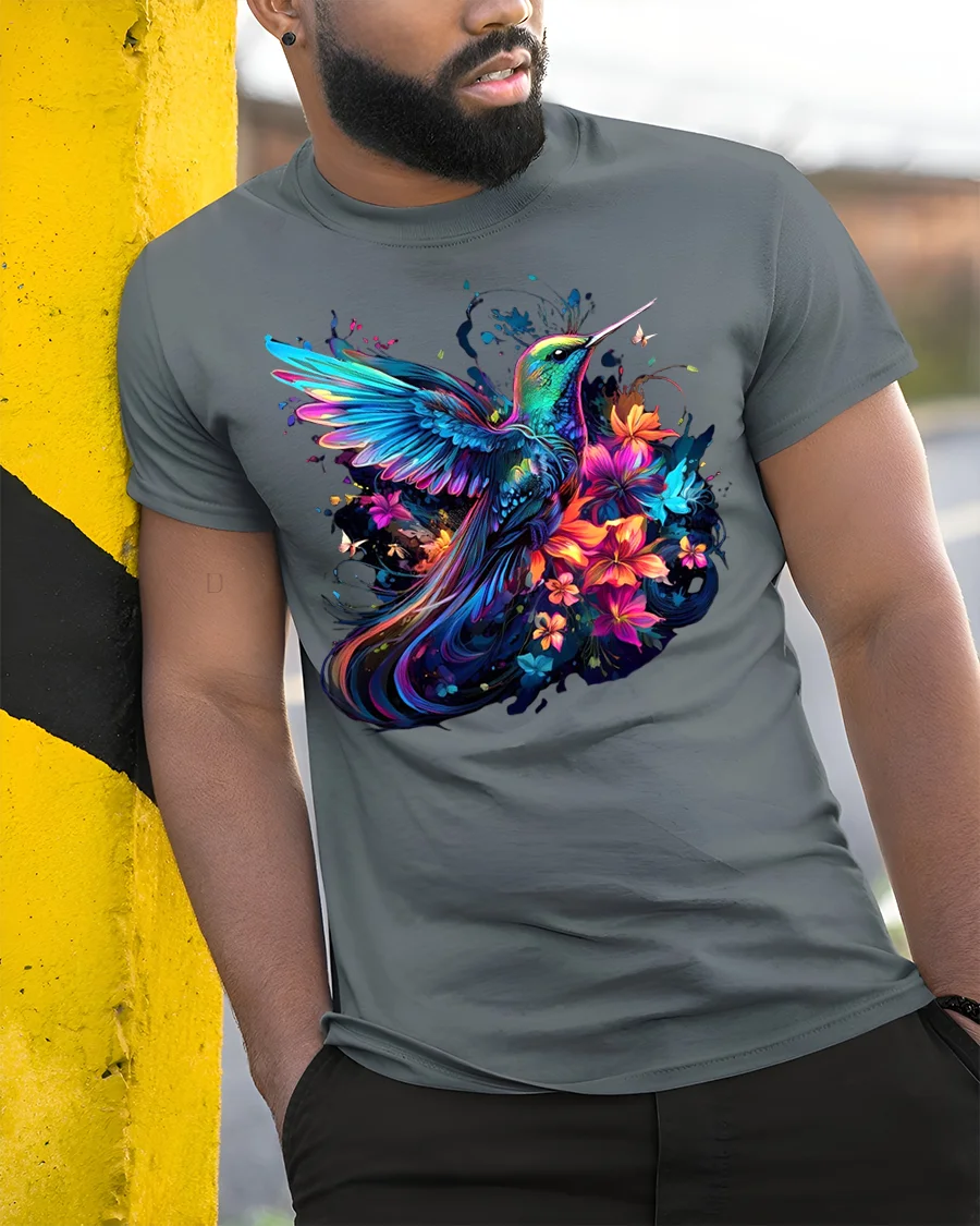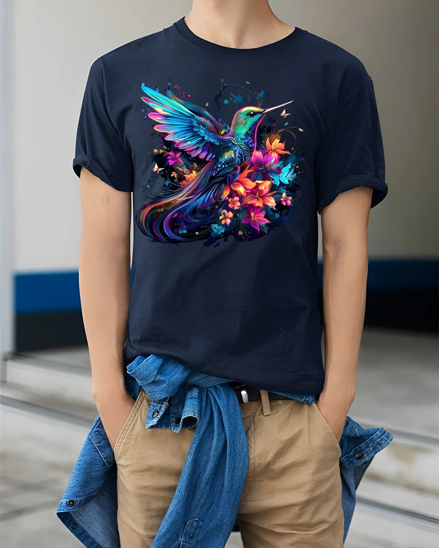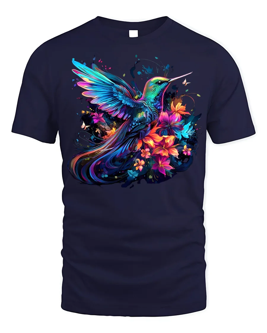 This stunning tee showcases a vividly colored hummingbird gracefully hovering amidst a bouquet of bright, stylized flowers.