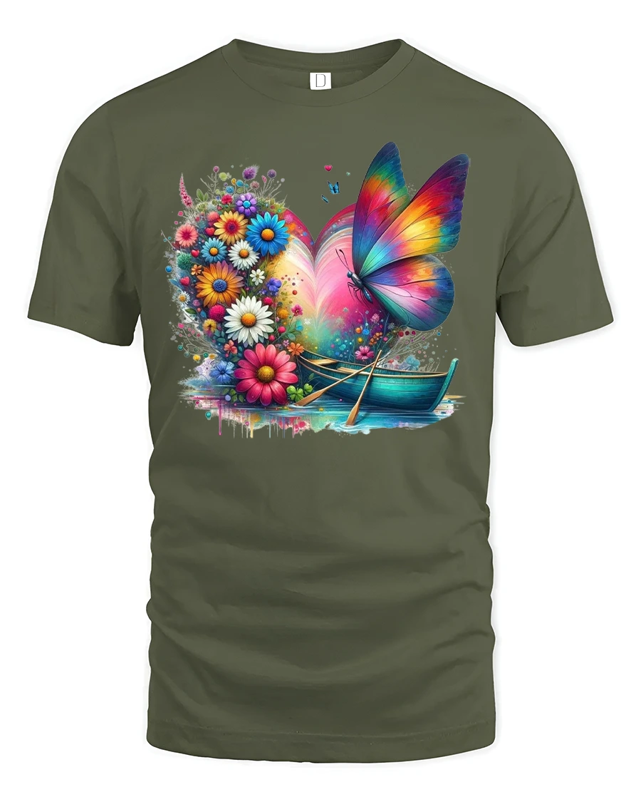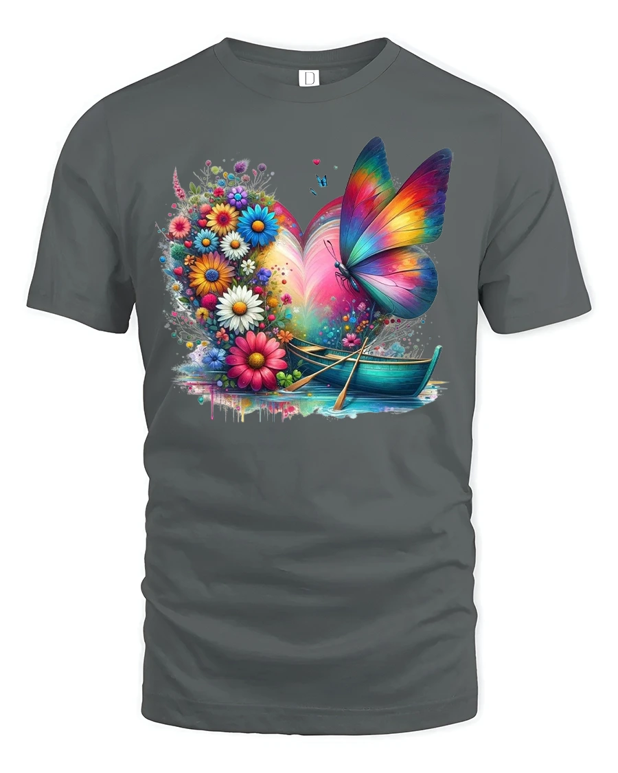 Rainbow Butterfly Garden Boat Fantasy Graphic Tee brings a burst of color, life, and imagination into your wardrobe. Featuring a stunning rainbow butterfly spreading its wings alongside a boat surrounded by vivid flowers, this shirt perfectly blends artistry with fashion. The design radiates positivity, making it an eye-catching piece for nature lovers, dreamers, and anyone who enjoys colorful, expressive apparel.