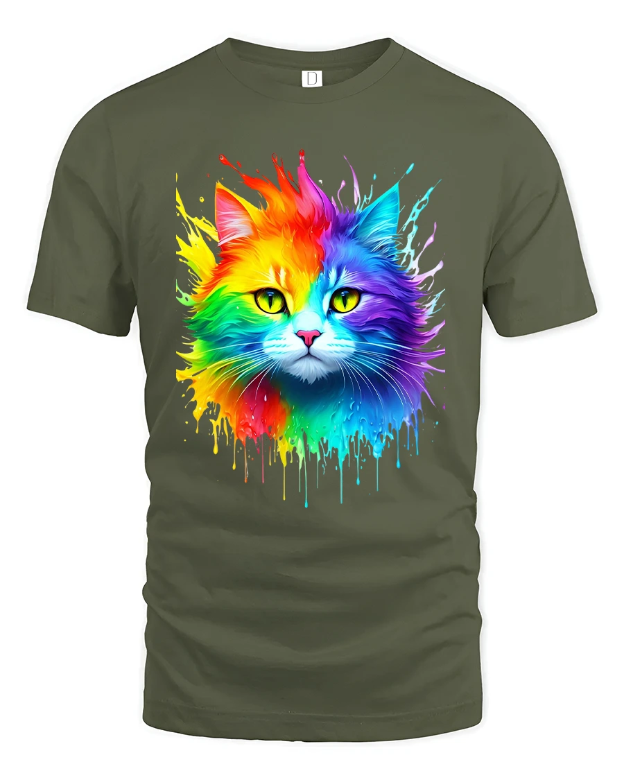 This rainbow cat tee features a striking cat face surrounded by vivid paint splash effects and expressive rainbow tones.