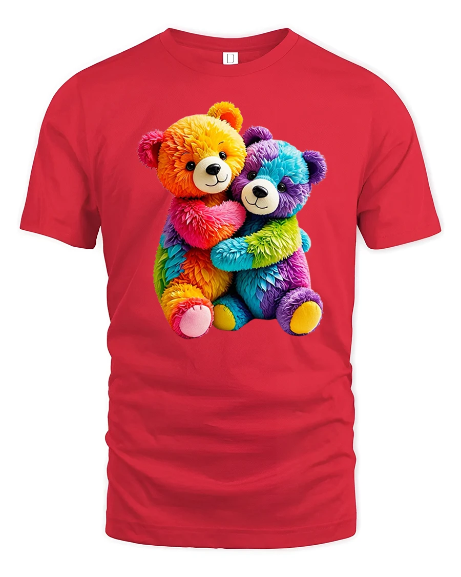 Add a burst of happiness to your wardrobe with this Rainbow Teddy Bears Hug T Shirt Cute Colorful Plush Tee. The charming design features two vibrant teddy bears wrapped in a warm embrace, showcasing bright rainbow tones and soft plush textures that radiate joy and friendship. This delightful artwork captures a heartwarming moment filled with love, positivity, and playful charm.