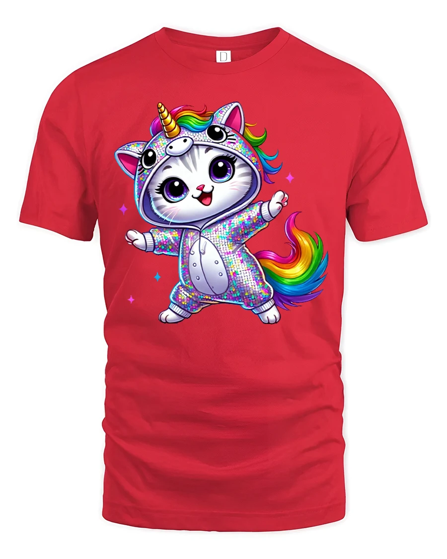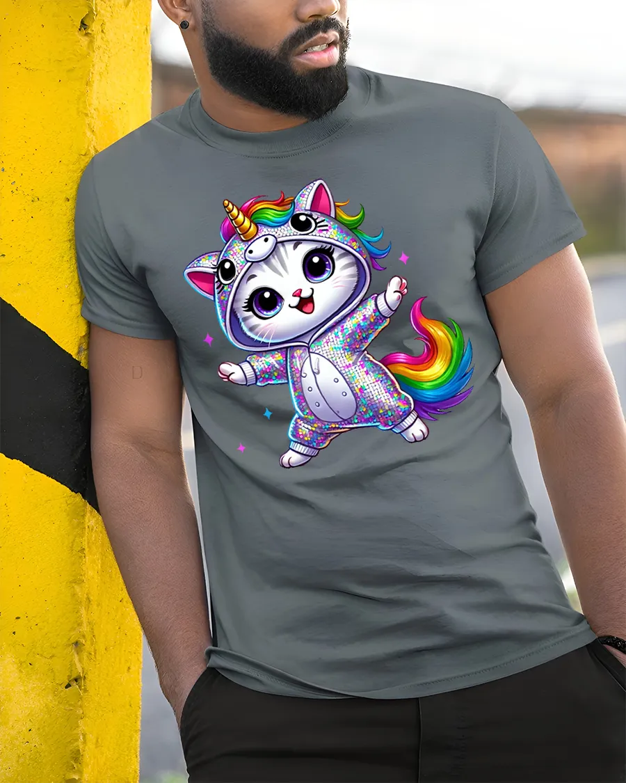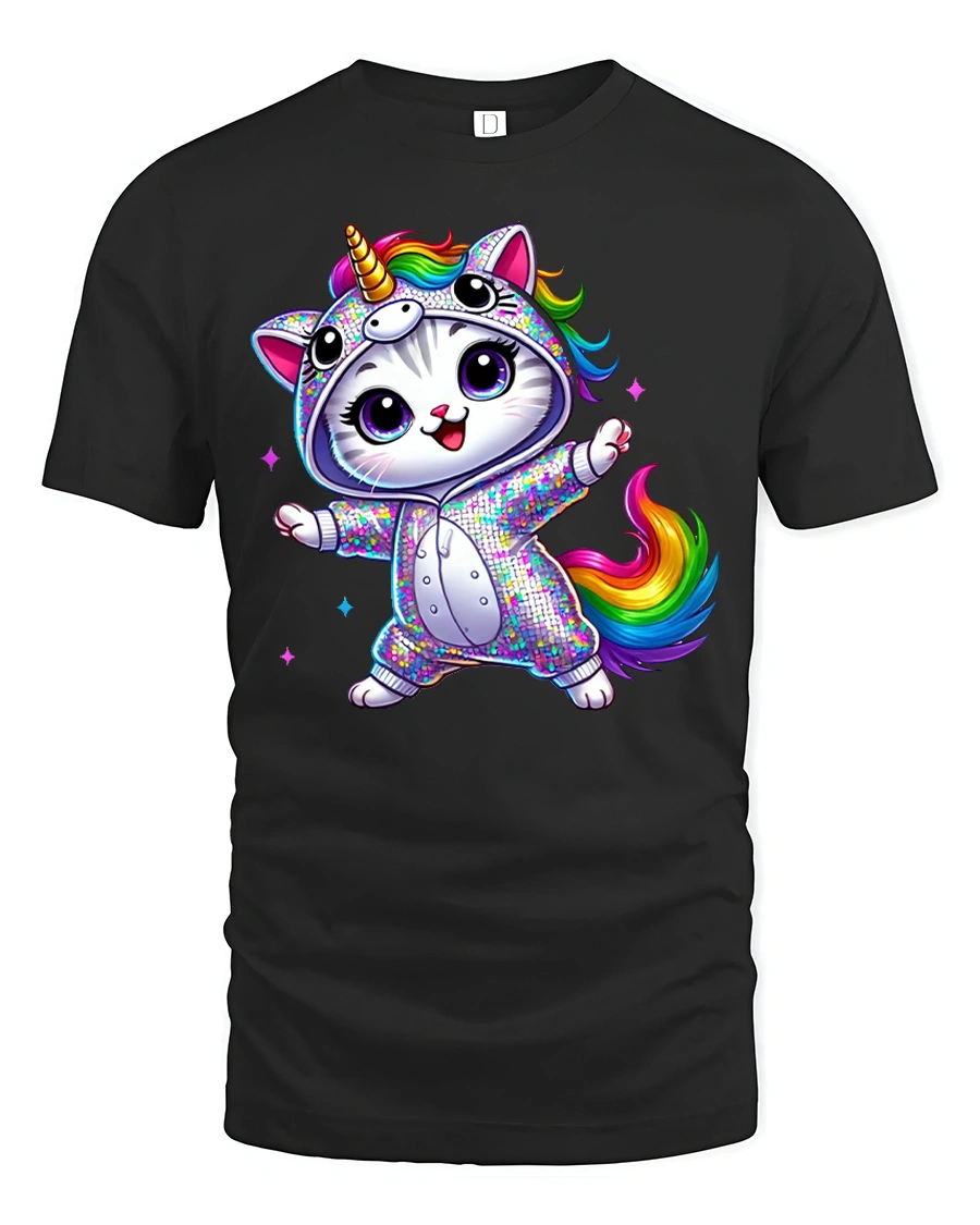 Rainbow Unicorn Cat Dance Magic Graphic Tee for Kids and Adults is the perfect choice for anyone who loves adorable designs, bright colors, and a touch of fantasy. Featuring a joyful kitty dressed in a sparkling unicorn onesie, this tee brings instant happiness with every wear. The vibrant rainbow tail, big expressive eyes, and playful pose make it a standout piece that captures the imagination of both kids and adults who enjoy fun and whimsical styles.