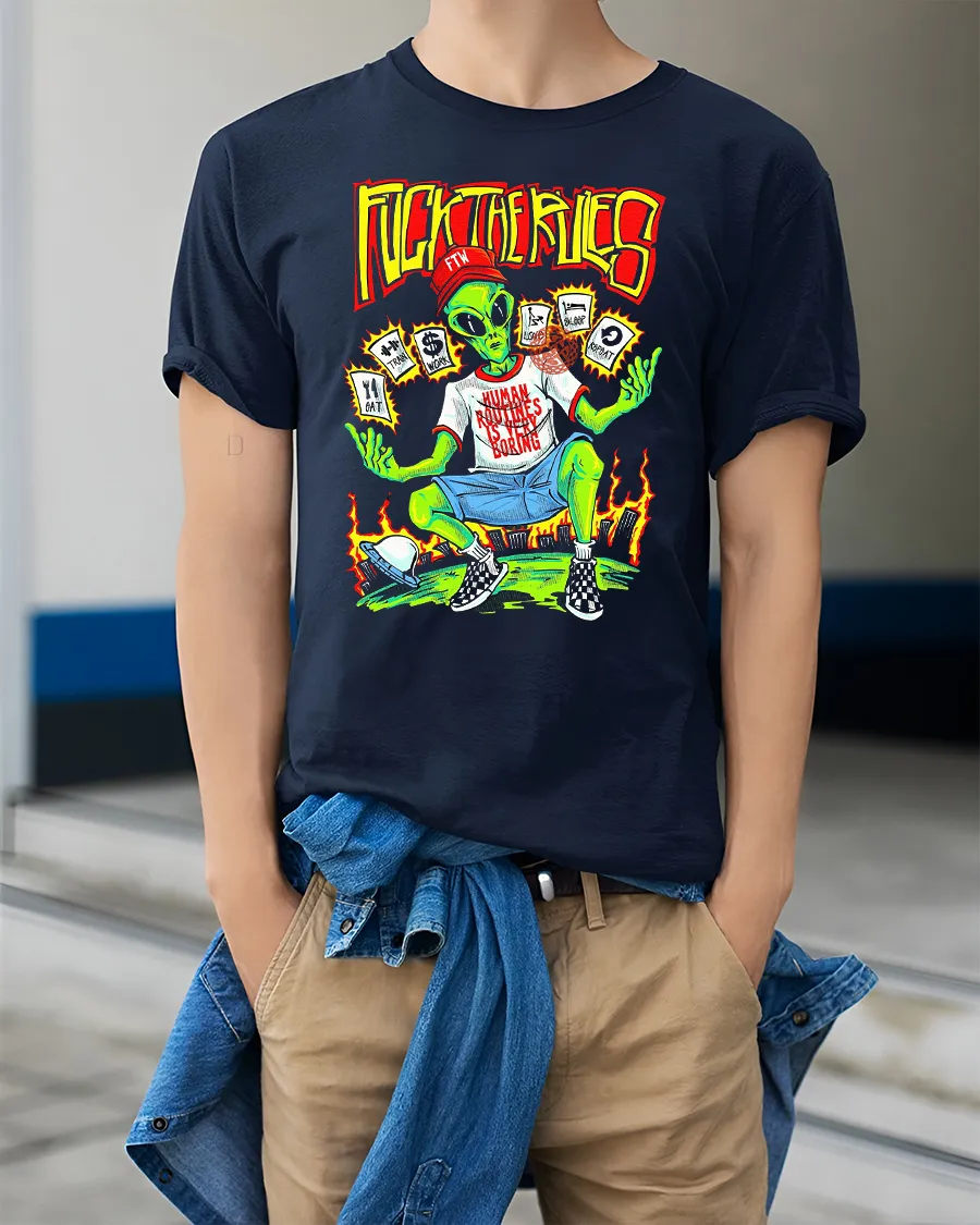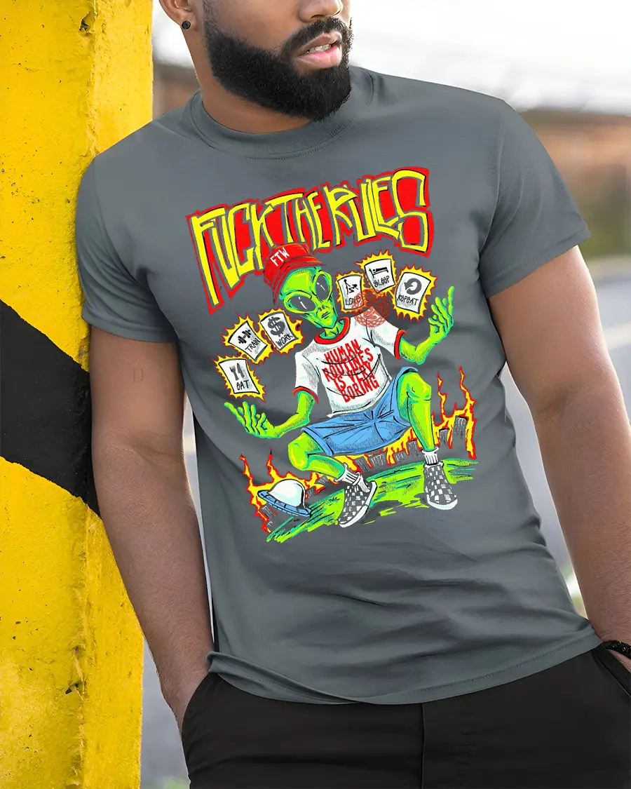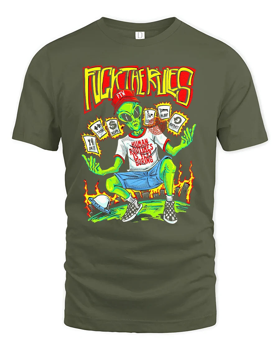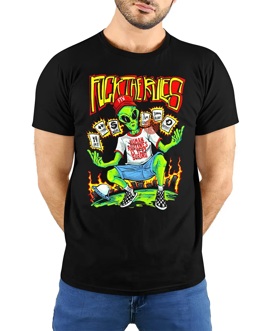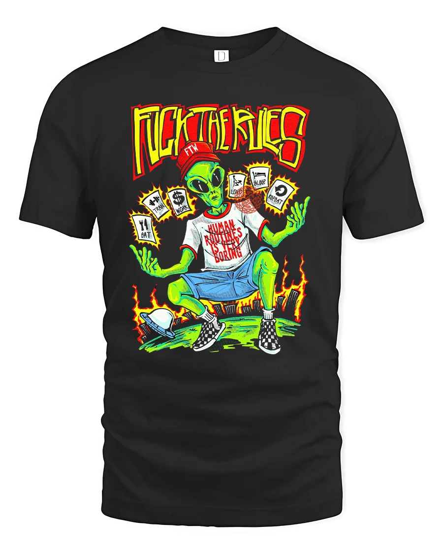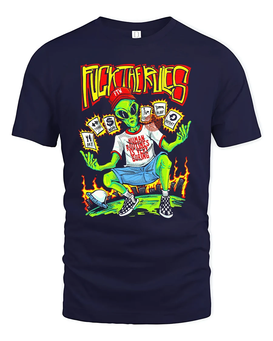 Perfect for fans of alien art, street culture, and humorous designs, this tee is also a great gift for anyone who appreciates quirky fashion. Express your unique style and attitude with this rebellious alien graphic shirt that combines humor, sci-fi, and streetwear into one striking look.