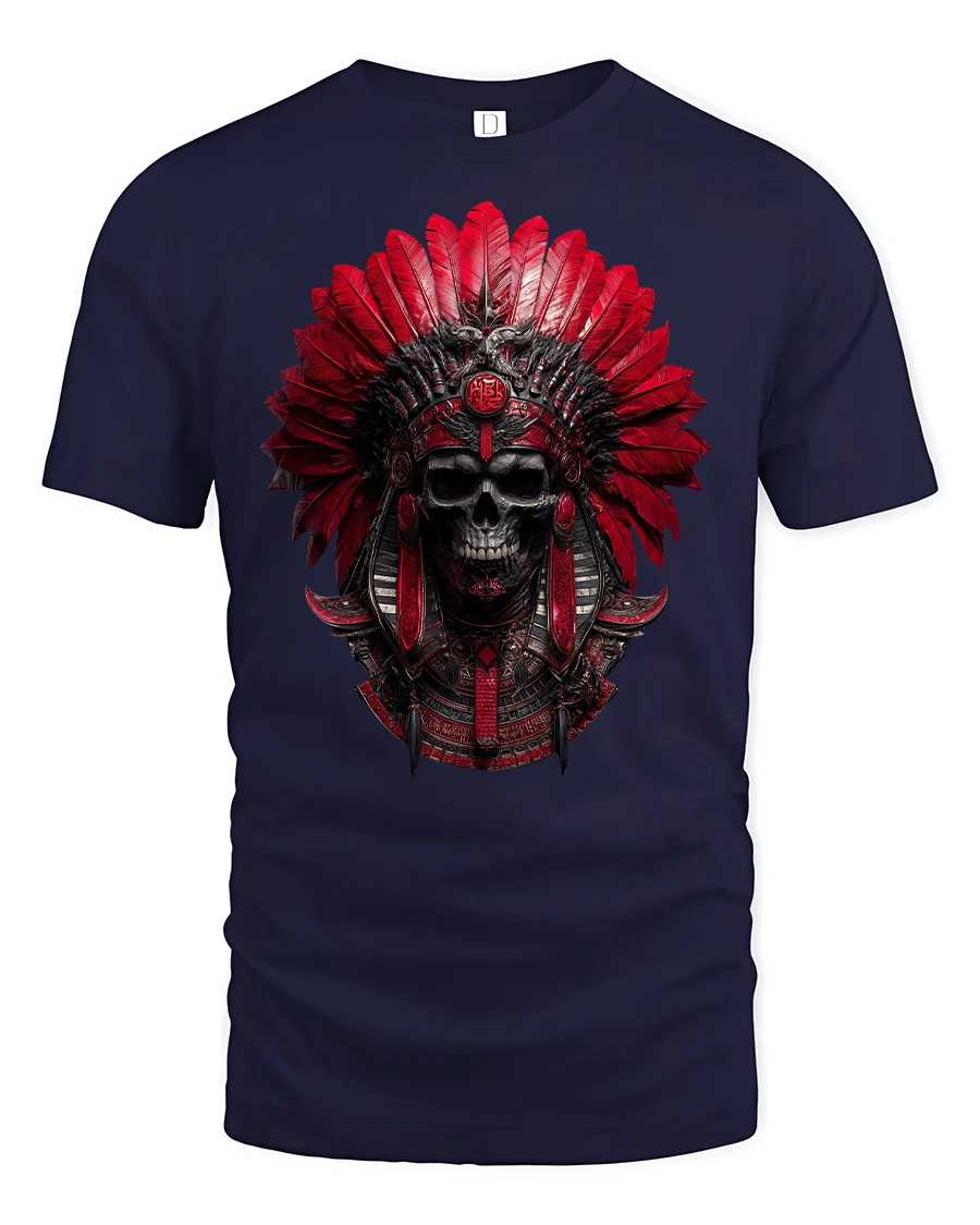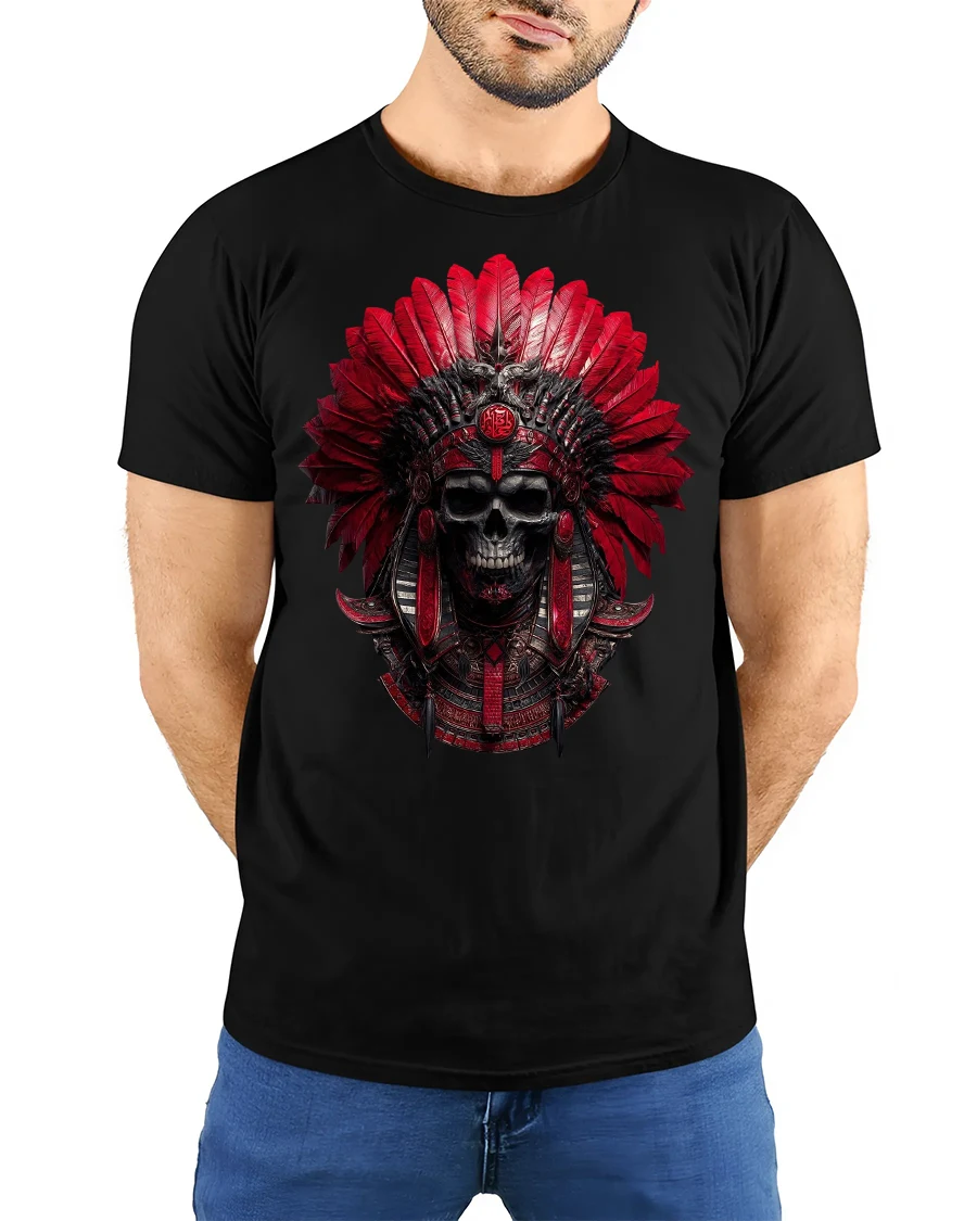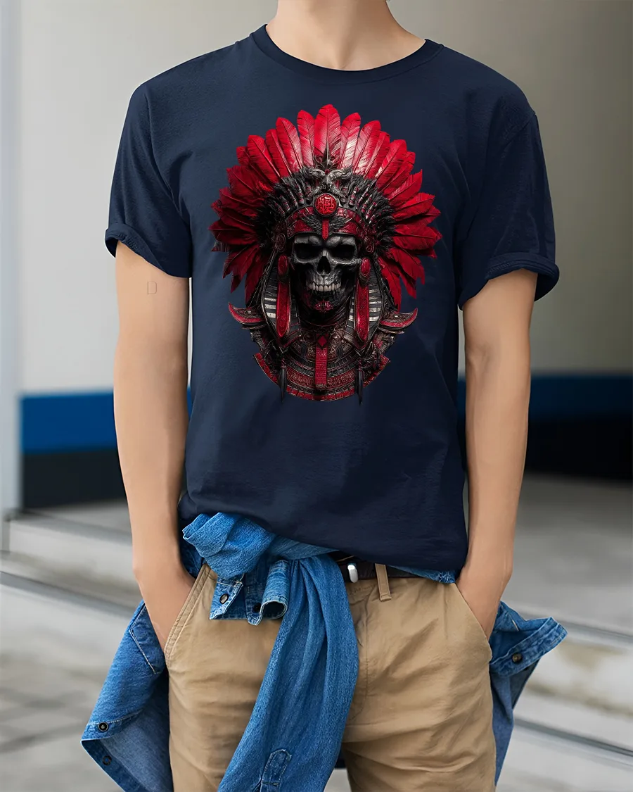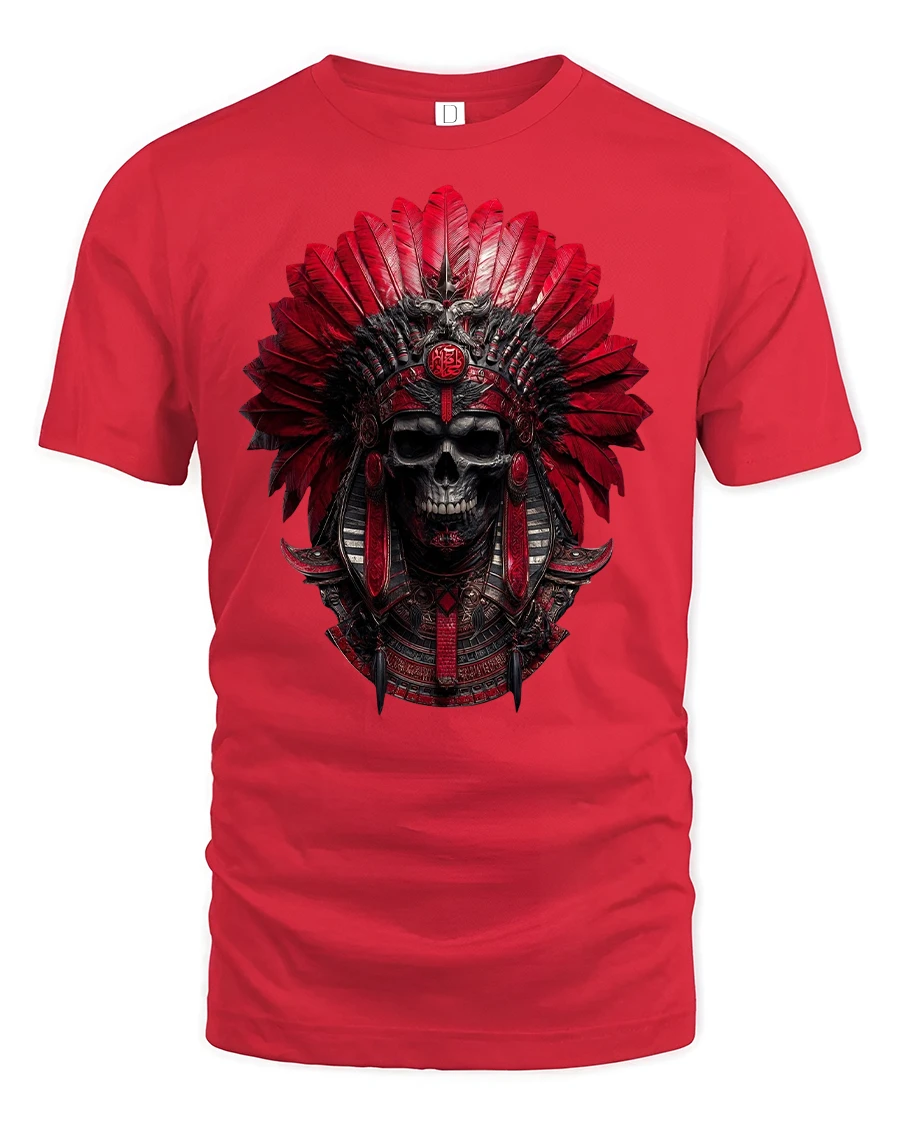 Command attention with this Red Tribal Skull Warrior Headdress Graphic T-Shirt, a striking design that fuses gothic power with tribal artistry.