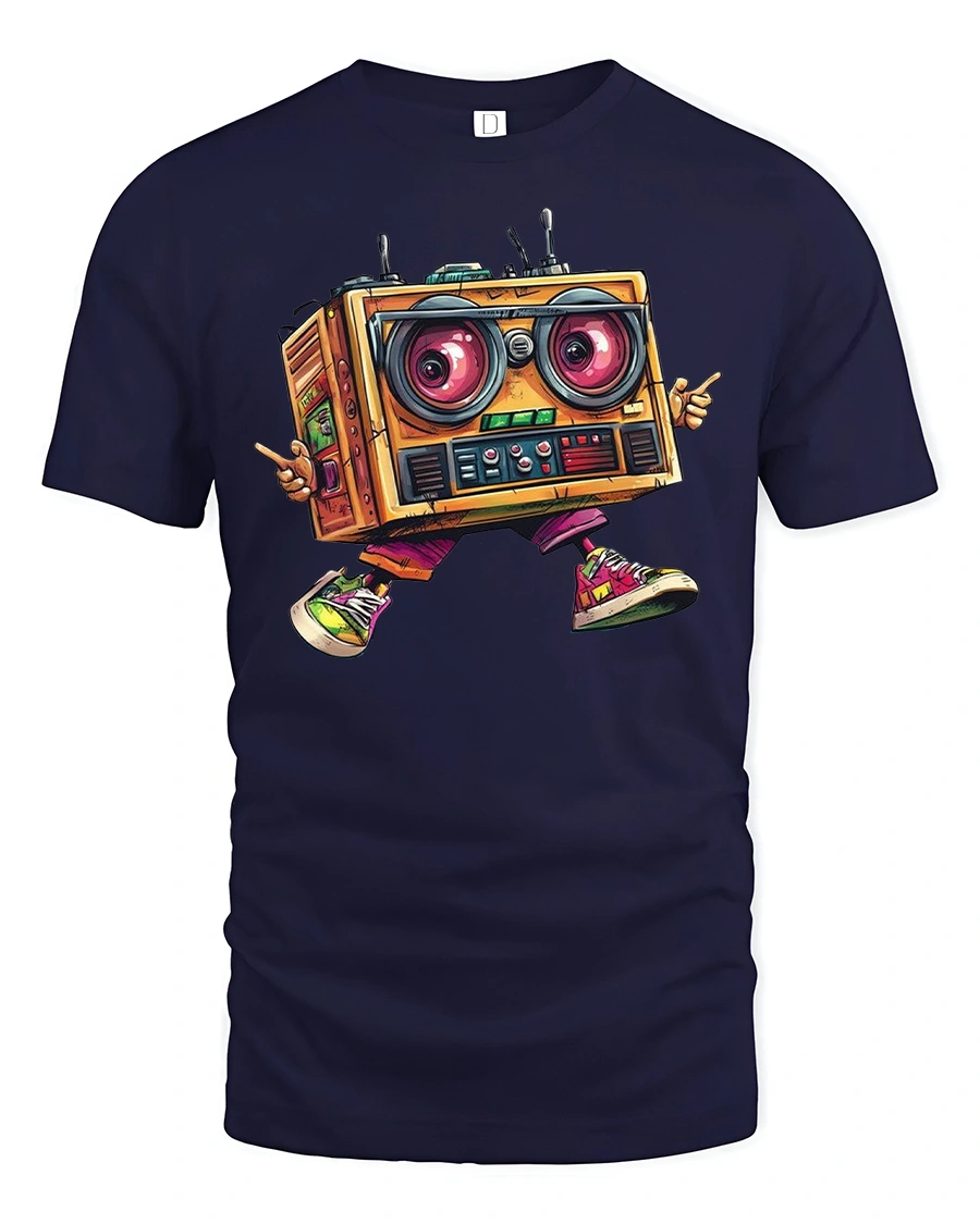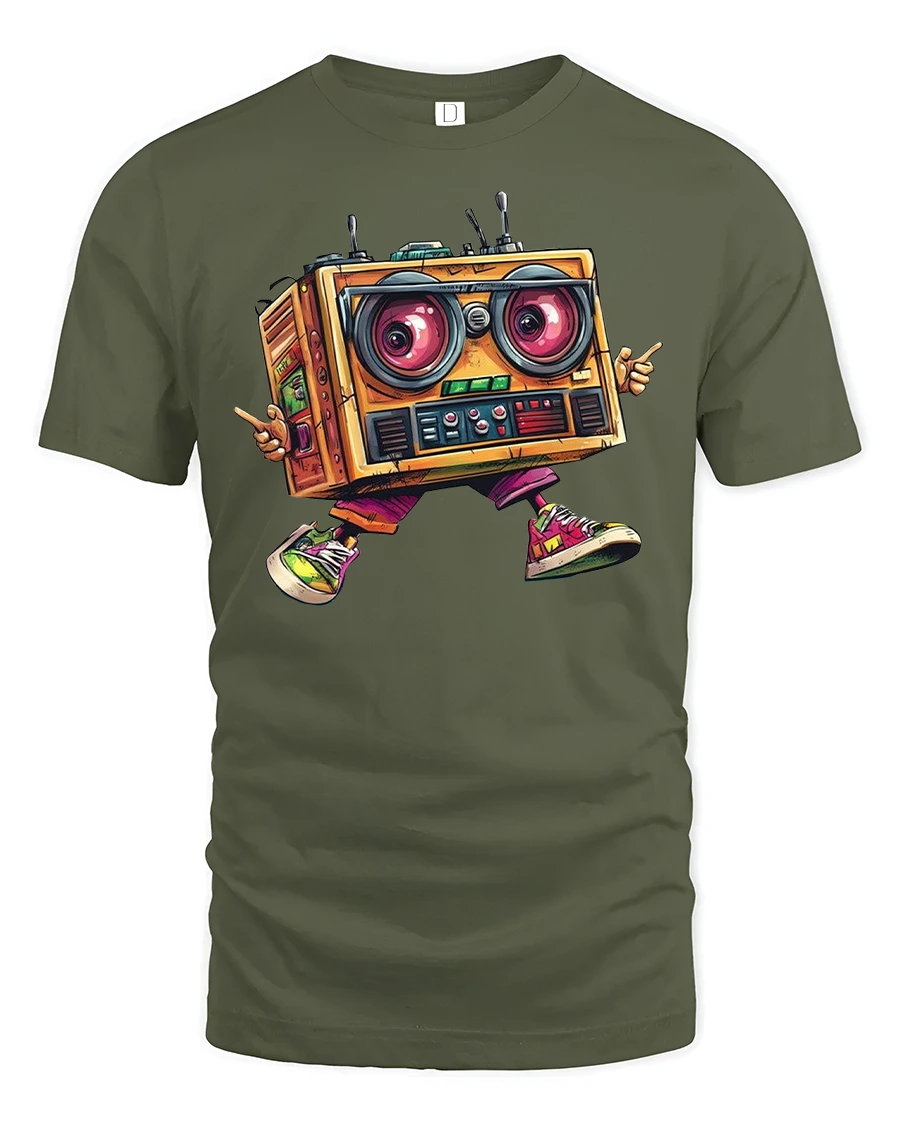 Featuring a colorful, animated boombox character with sneakers and attitude, this tee captures the spirit of retro music and 80s hip-hop vibes.