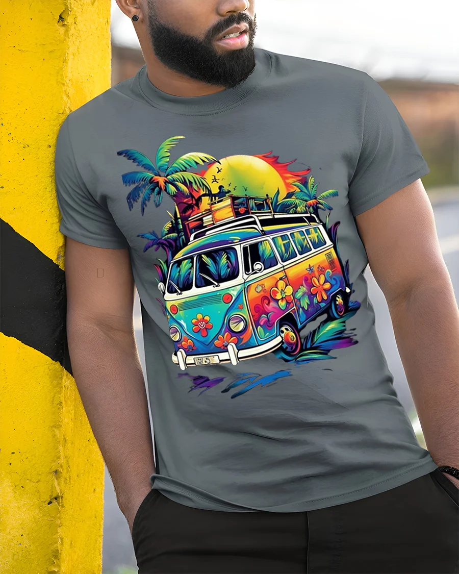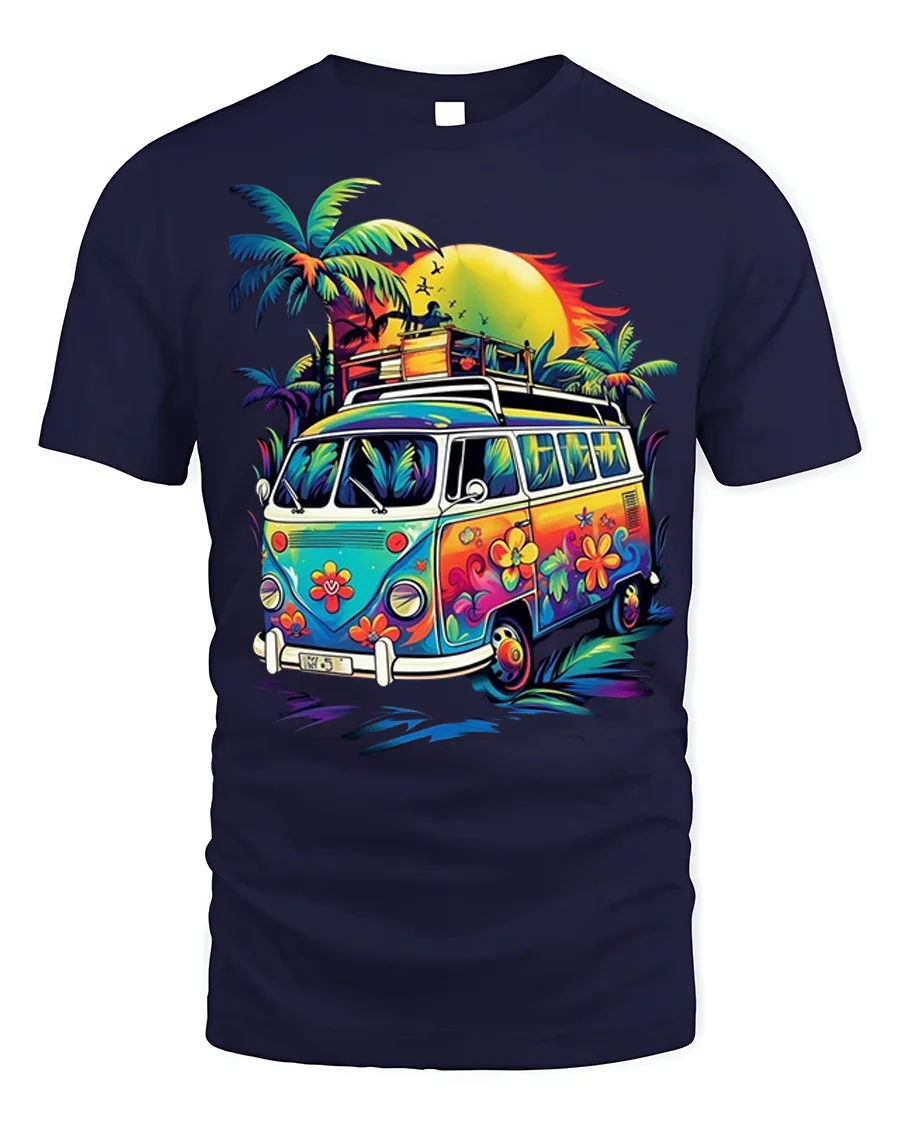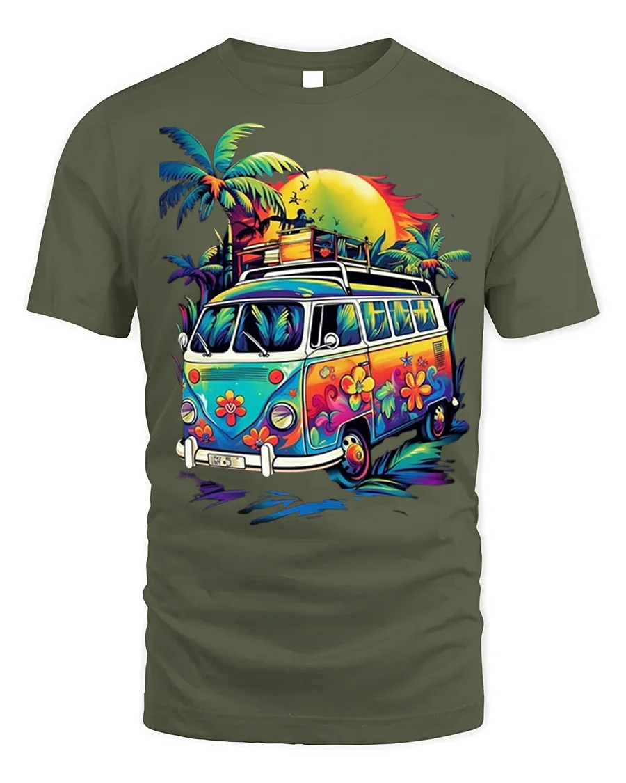 Hit the road to good vibes with our Retro Hippie Van T-Shirt. This vibrant tee features a classic flower power bus parked under a radiant sunset, surrounded by swaying palm trees, perfectly capturing that carefree beach and travel spirit. It’s an ideal choice for anyone who loves vintage aesthetics, road trips, or the laid-back bohemian lifestyle.