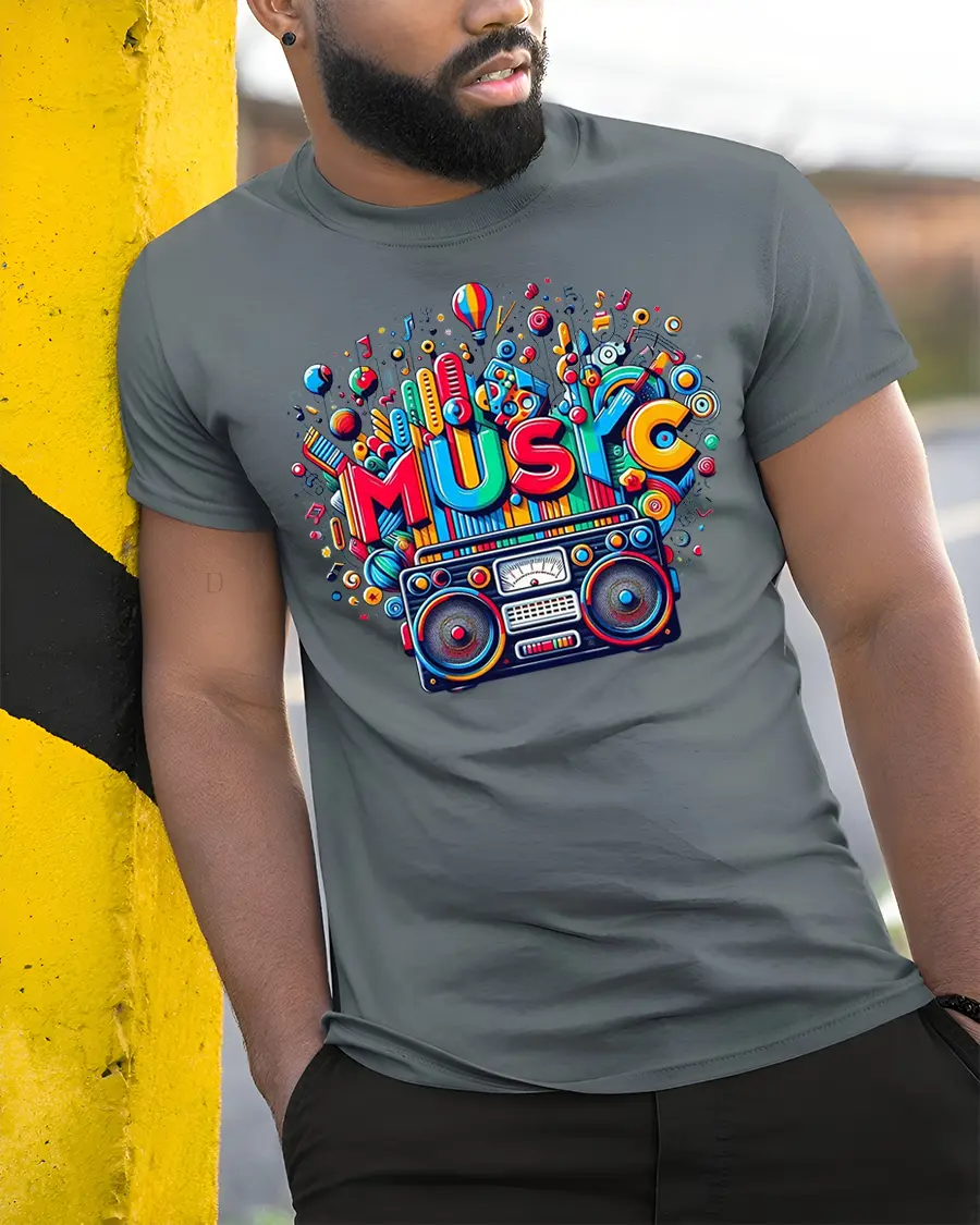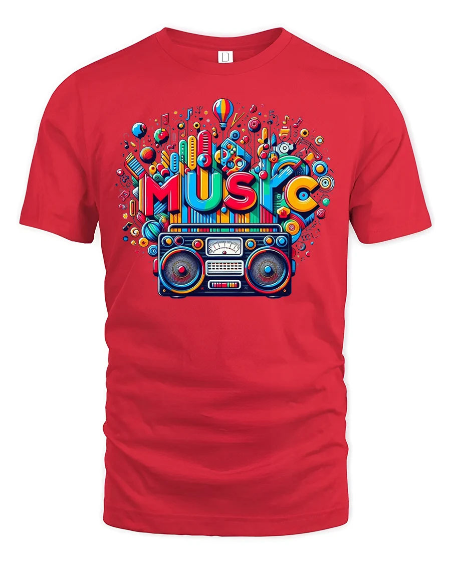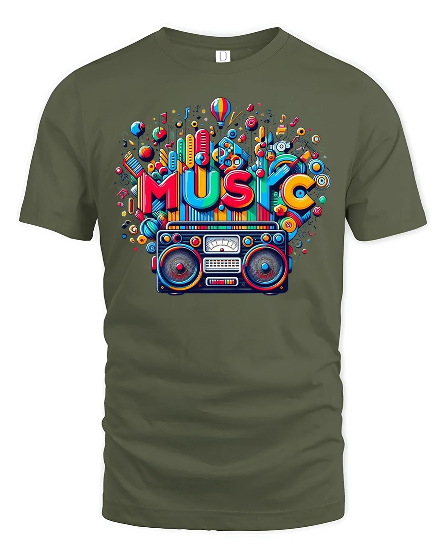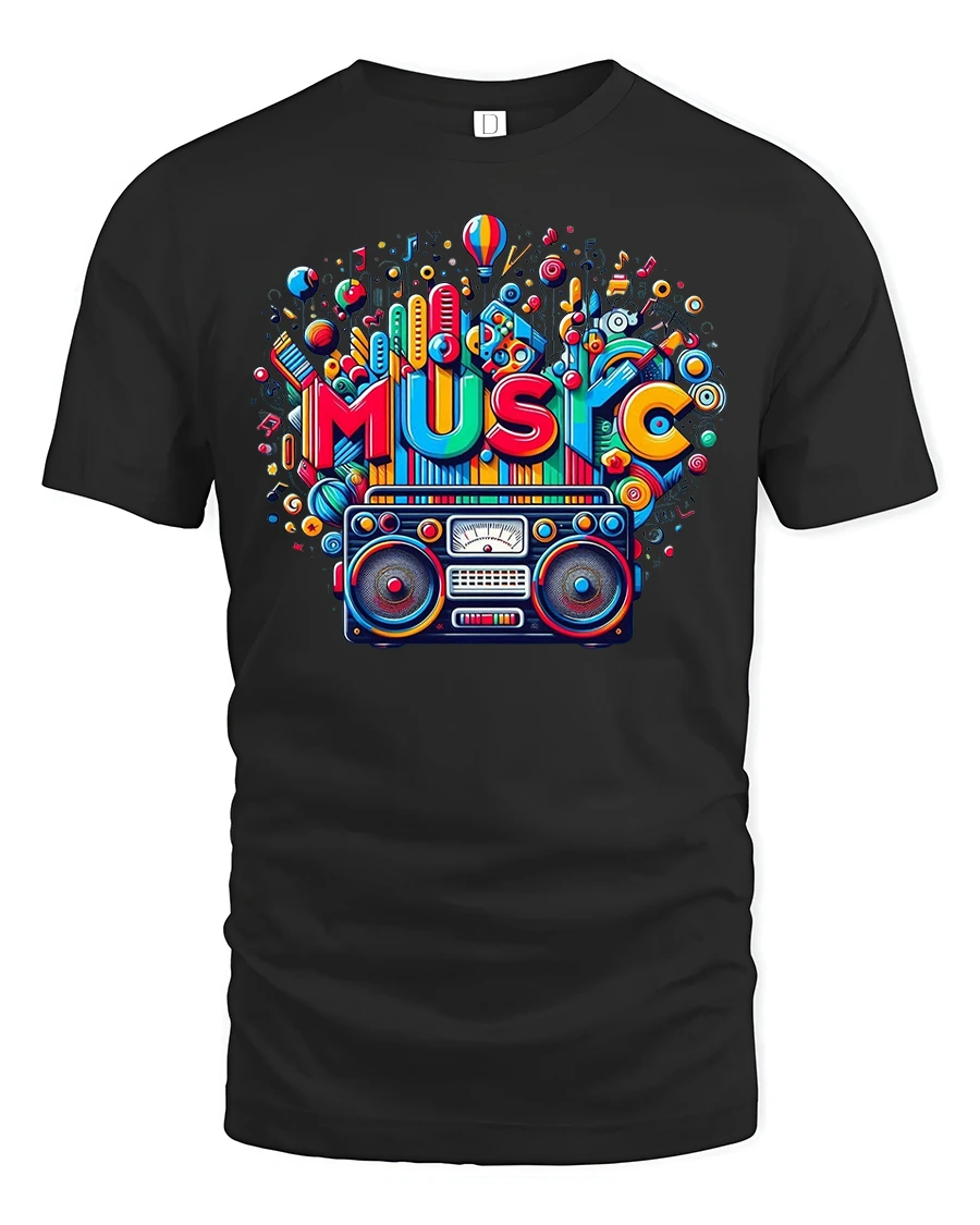 Featuring a bold and colorful design with a classic boombox and the word “MUSIC” exploding in bright patterns, this tee celebrates the joy of sound and rhythm.
