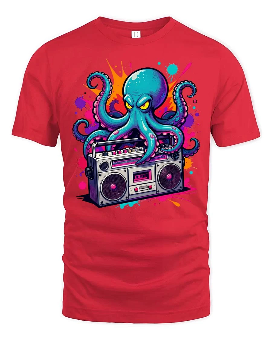 This octopus boombox t-shirt combines retro music nostalgia with modern streetwear energy.