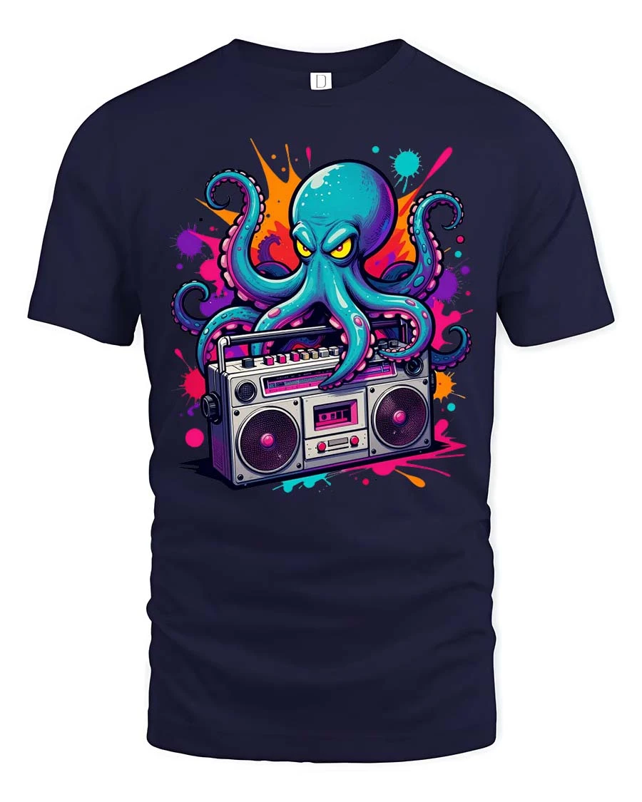 Add a splash of retro rhythm and ocean-inspired creativity to your look with this fun octopus boombox graphic tee.