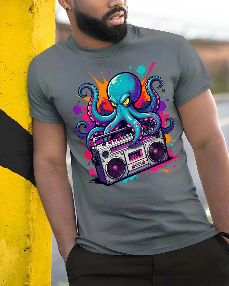 The detailed boombox and expressive octopus character add a playful and artistic touch that music lovers and graphic tee fans will appreciate.