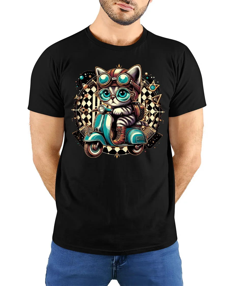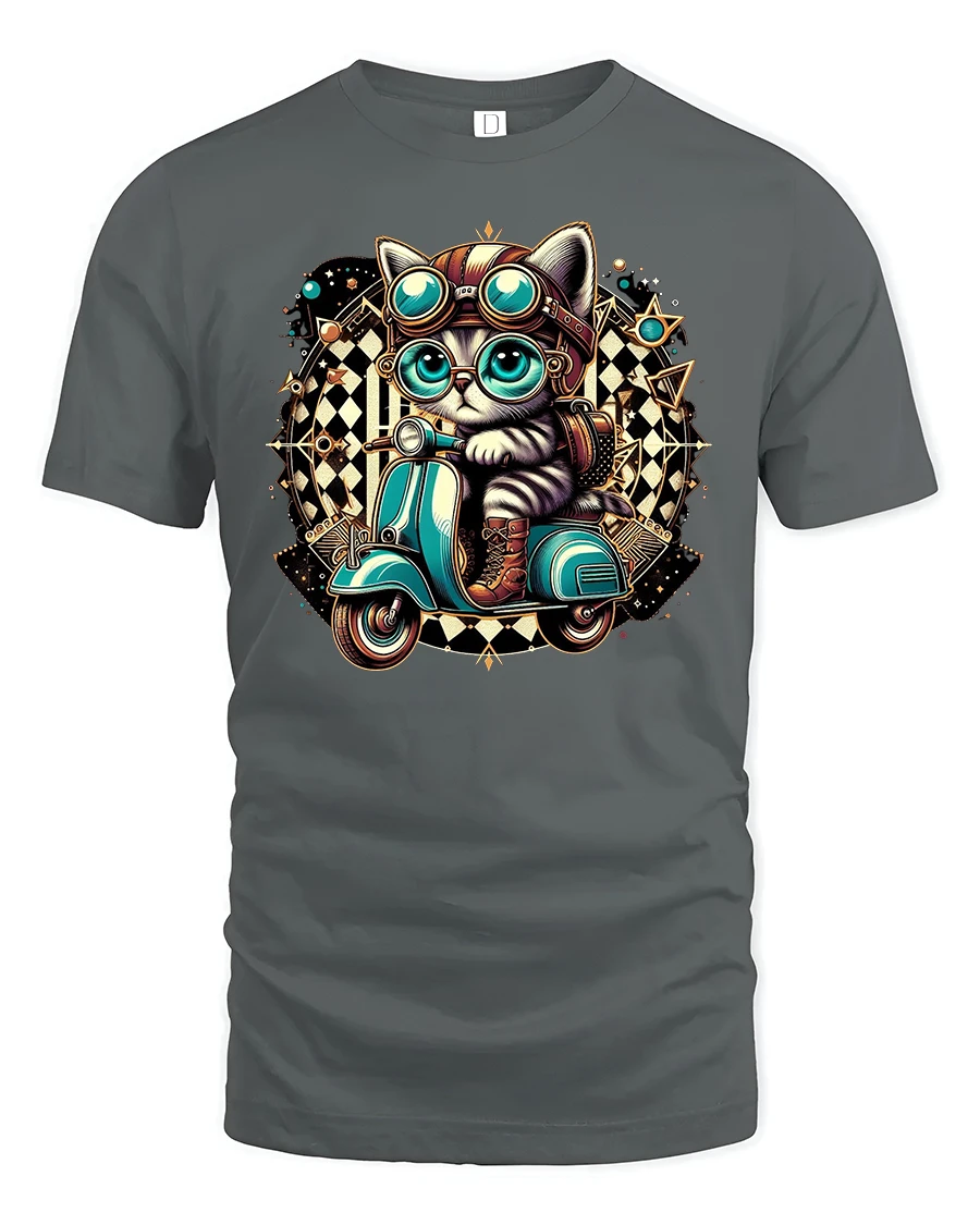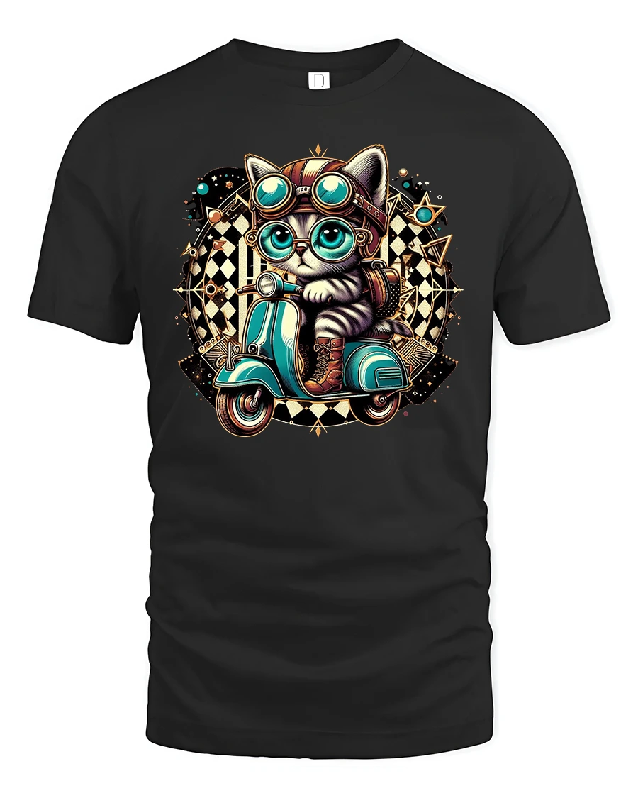 Retro Scooter Cat T-shirt with Steampunk Glasses is the perfect mix of cute, quirky, and stylish. Featuring an adorable kitten riding a vintage scooter while rocking retro aviator goggles, this design brings together charm and humor in a fun way. The steampunk-inspired details and geometric background add a unique artistic touch, making this tee a true standout.
