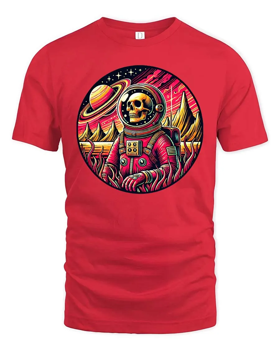 Retro Space Skull Astronaut Cosmic Galaxy Graphic Art Tshirt - red t-shirt on white background