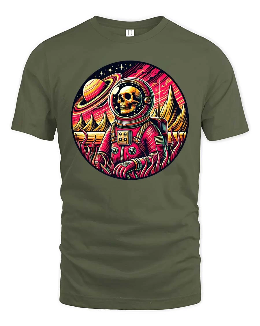 Retro Space Skull Astronaut Cosmic Galaxy Graphic Art Tshirt - military green t-shirt on white background