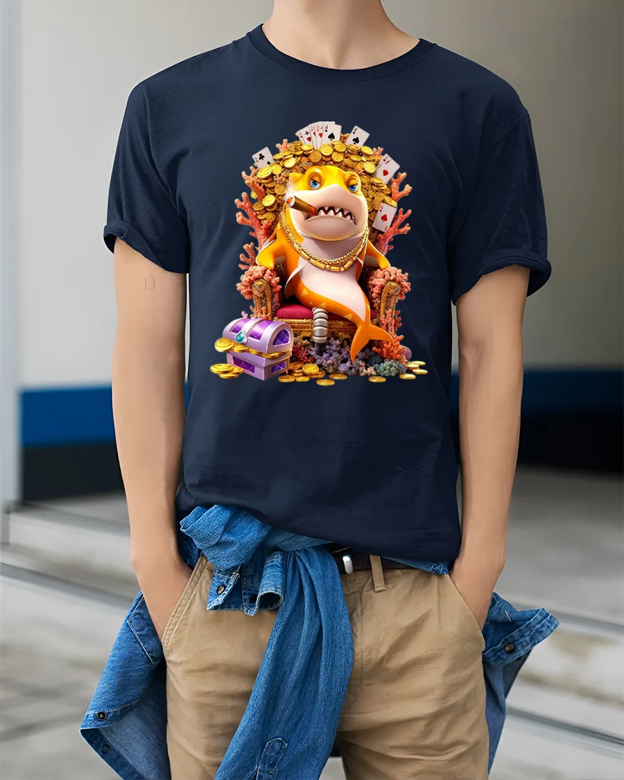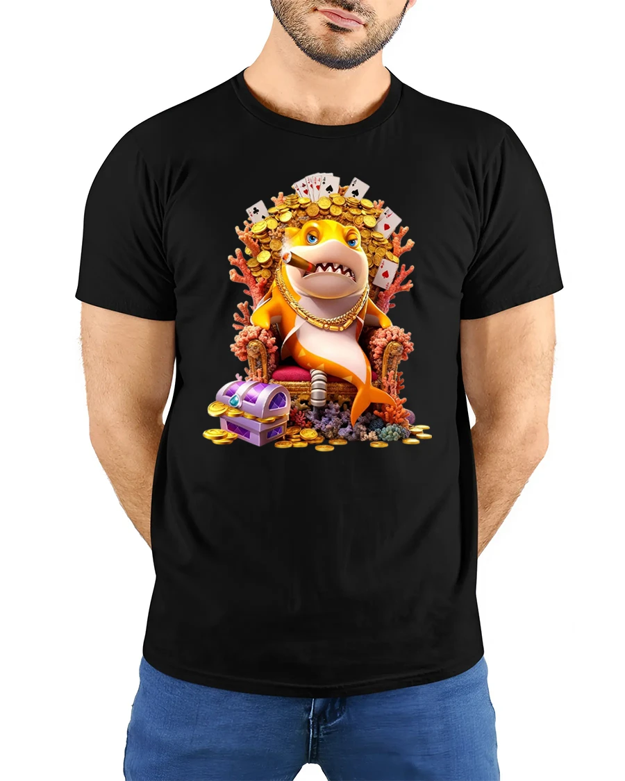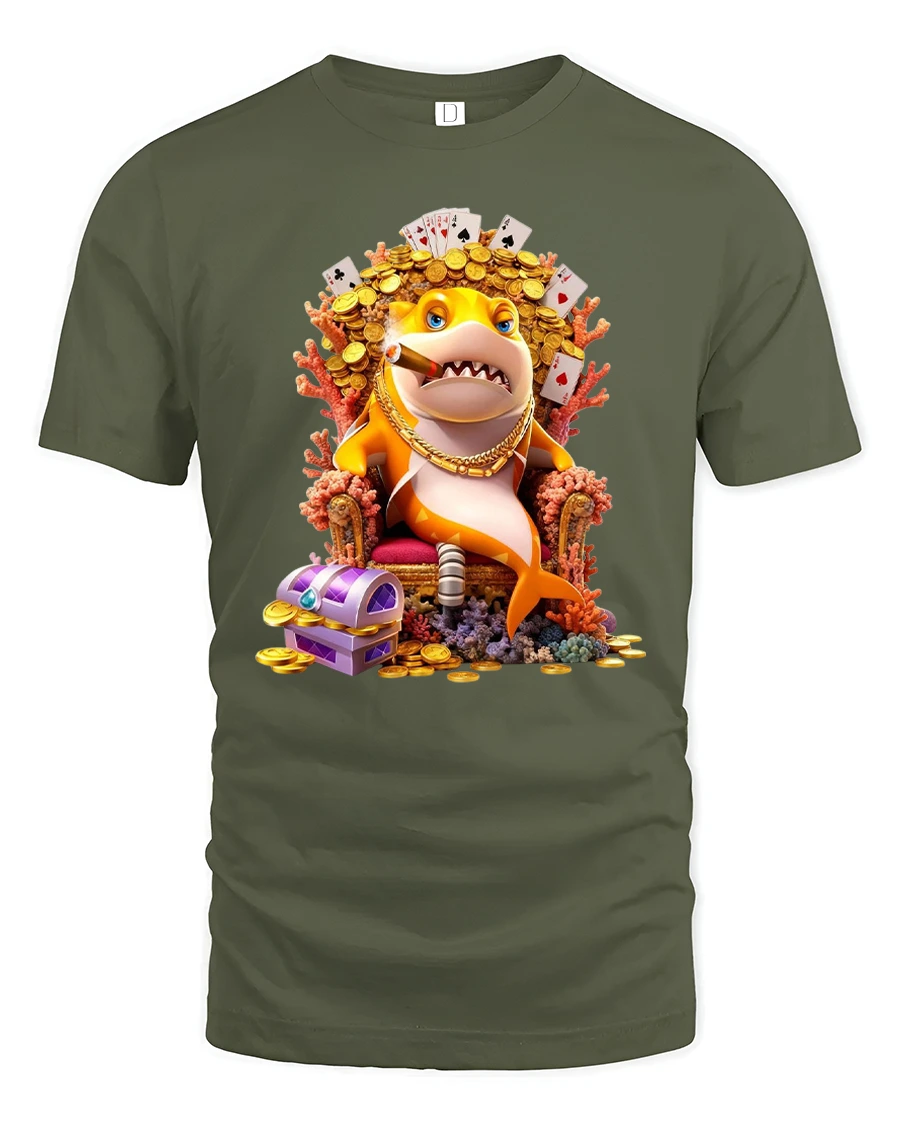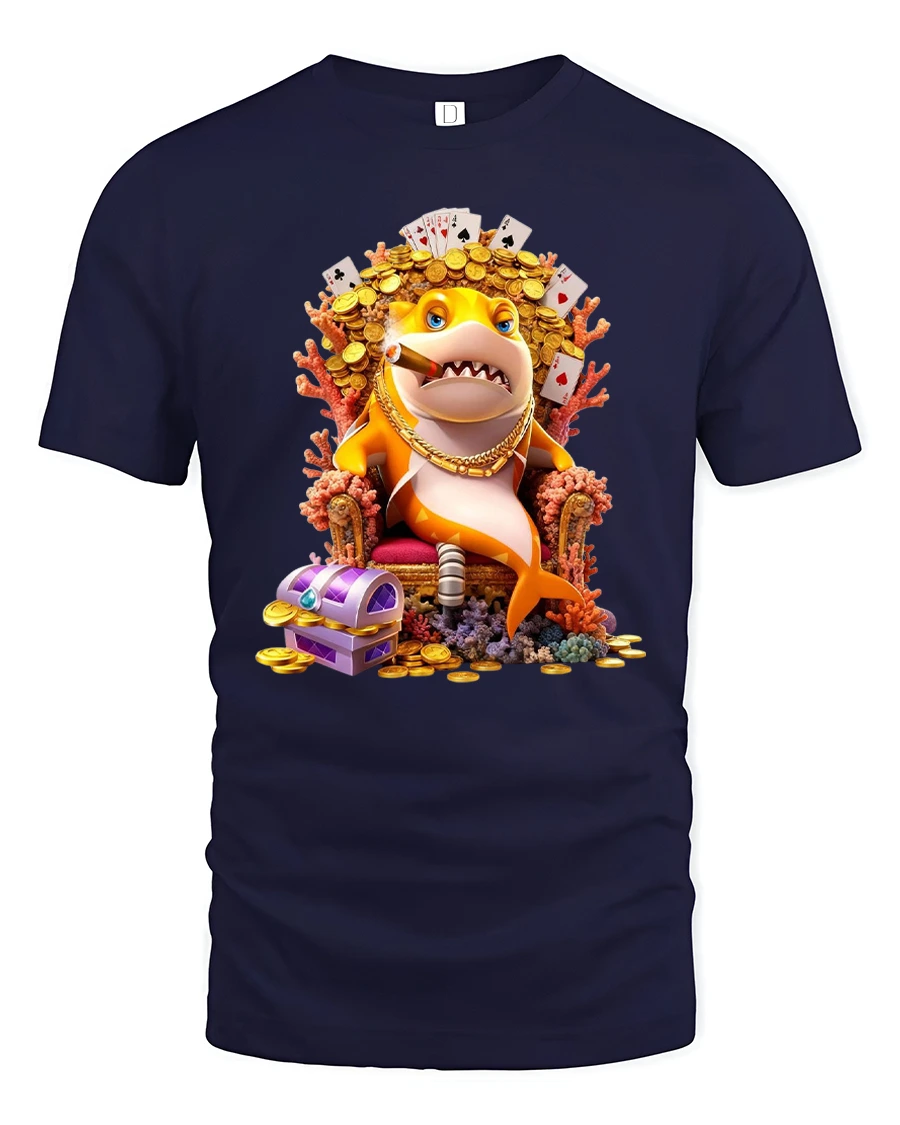 This shark graphic tee features a fearless cartoon shark sitting on a throne surrounded by gold coins playing cards and treasure while confidently smoking a cigar.