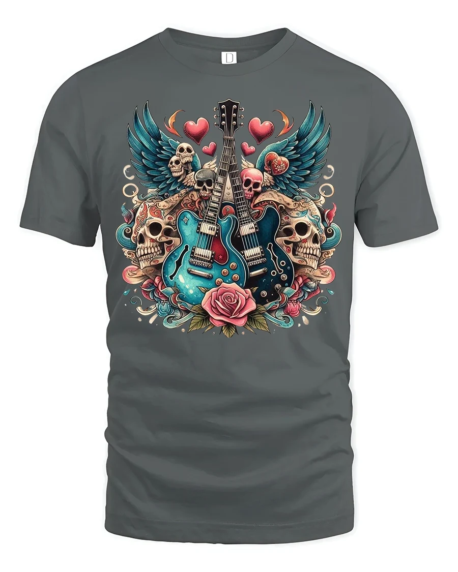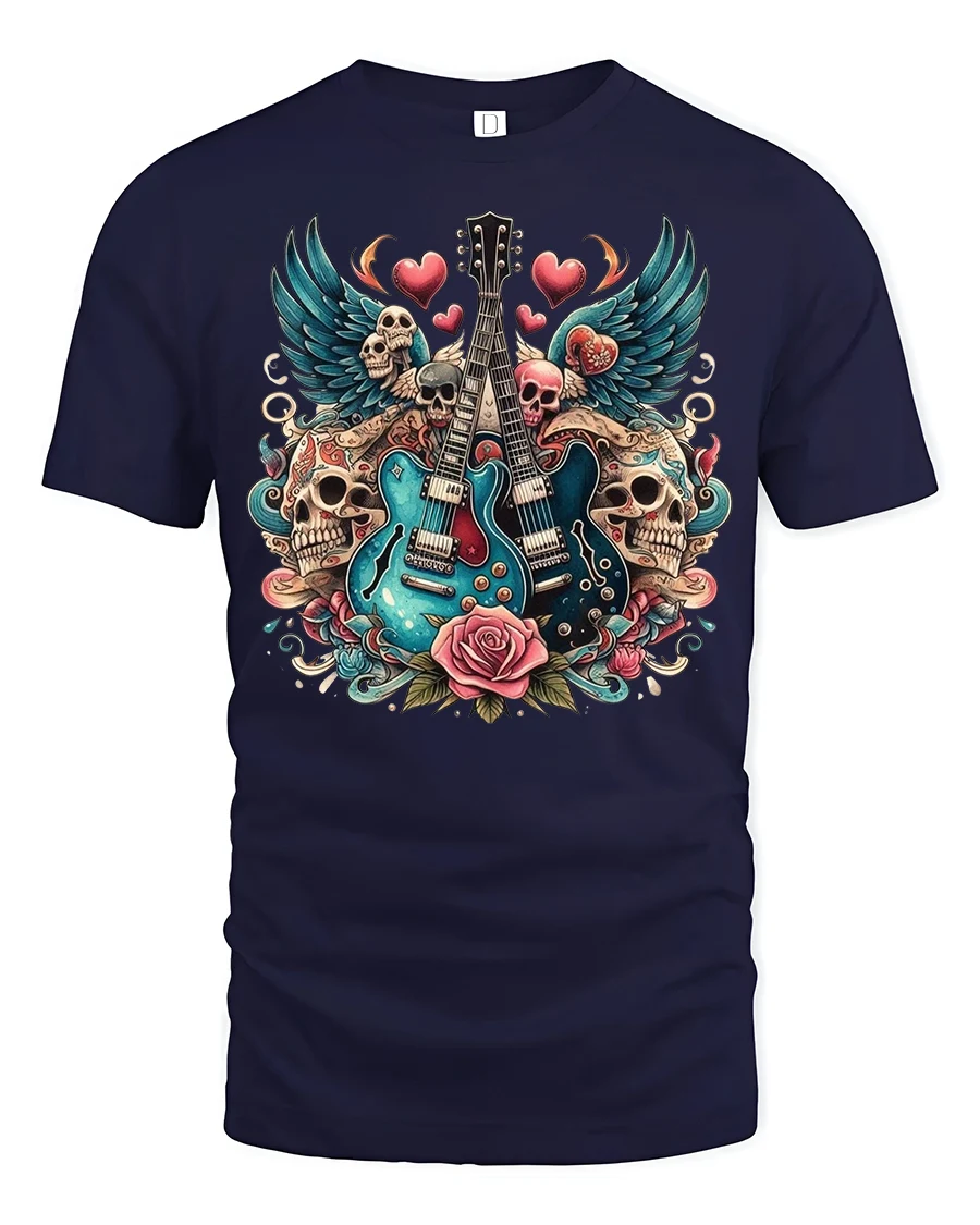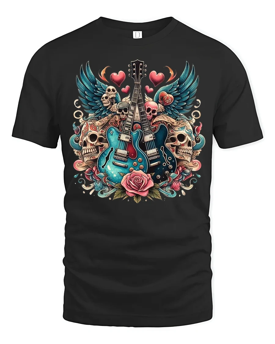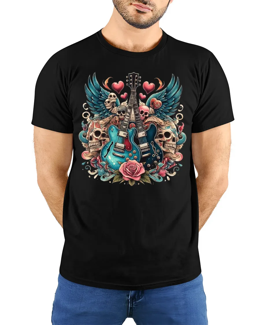 Rock Guitar Skulls and Roses Graphic T-Shirt for Music Fans brings high-energy rock style to your wardrobe with bold artwork that demands attention. Featuring twin electric guitars surrounded by skulls, wings, roses, and floating hearts, this tshirt blends edgy attitude with artistic detail. The vibrant colors and tattoo-inspired design capture the essence of rock culture, making it perfect for music lovers who live for loud riffs and striking visuals.