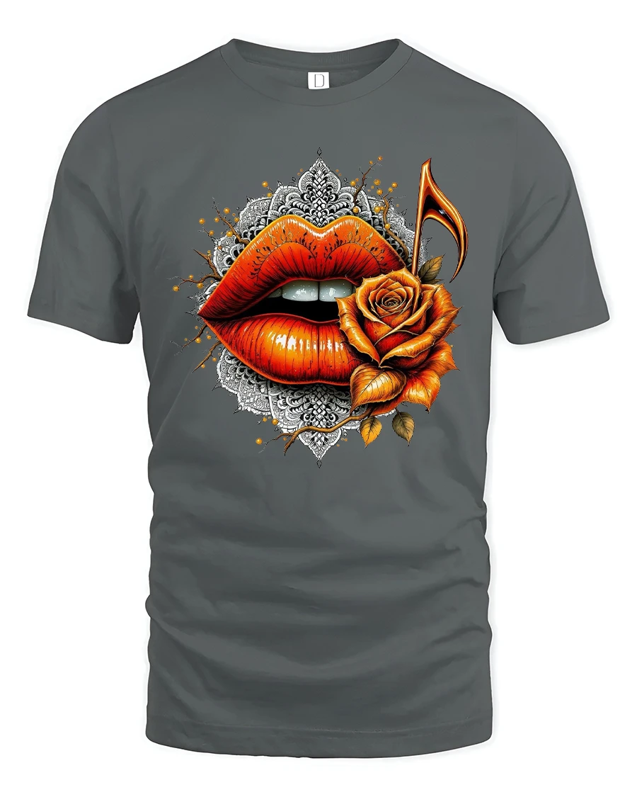 Rose Lips Music Note Graphic Tee Bold Artistic Love T Shirt showcases a striking design that blends romance music and expressive art.