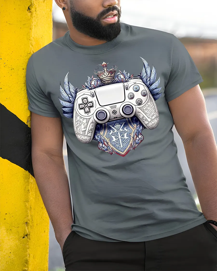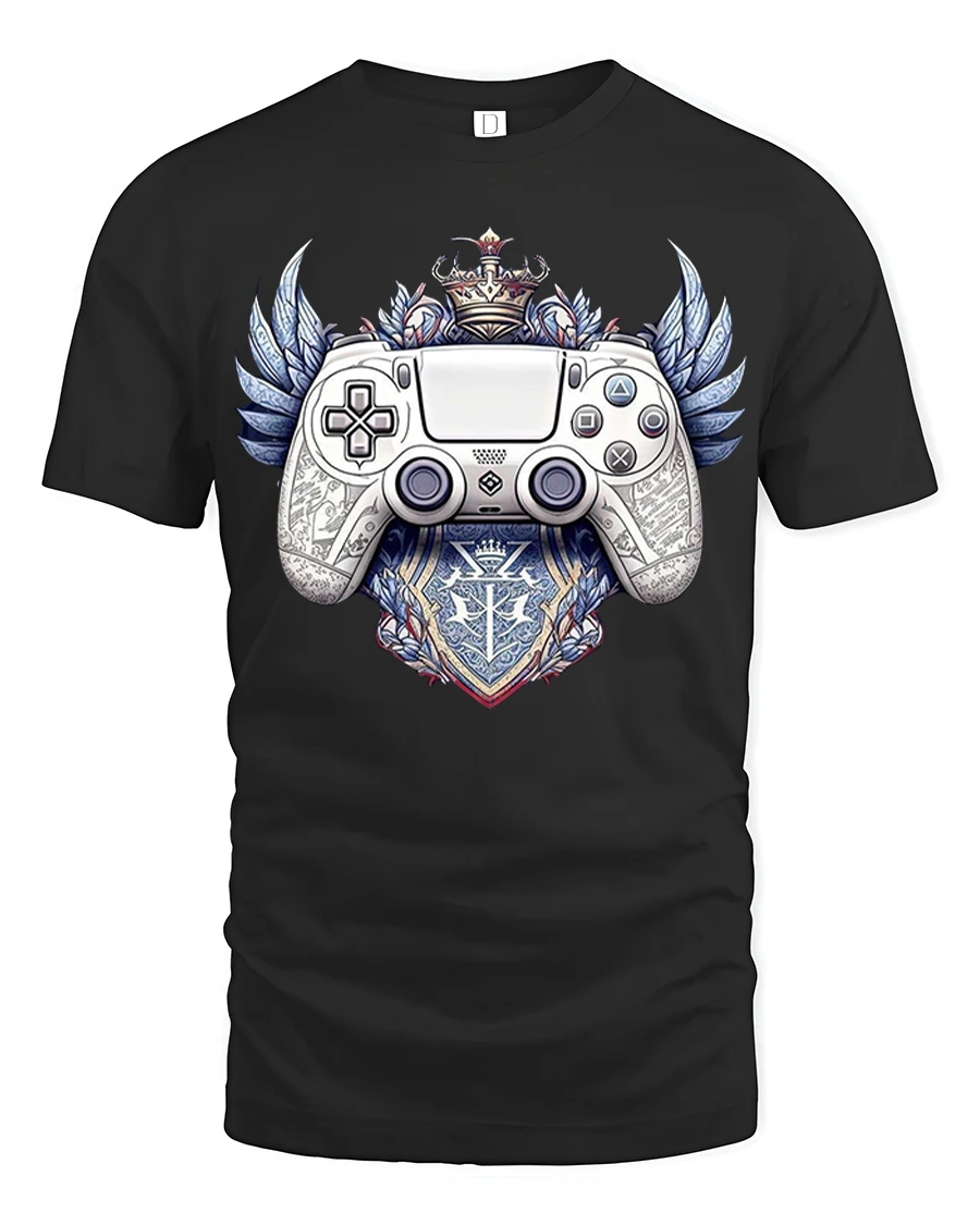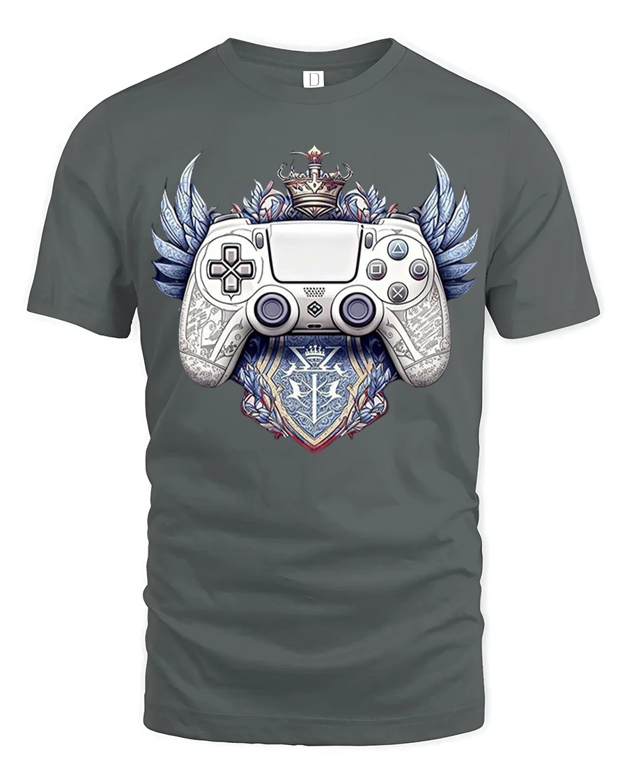 Show your passion for gaming with this gaming controller t shirt featuring a powerful crowned controller design set within a royal crest.