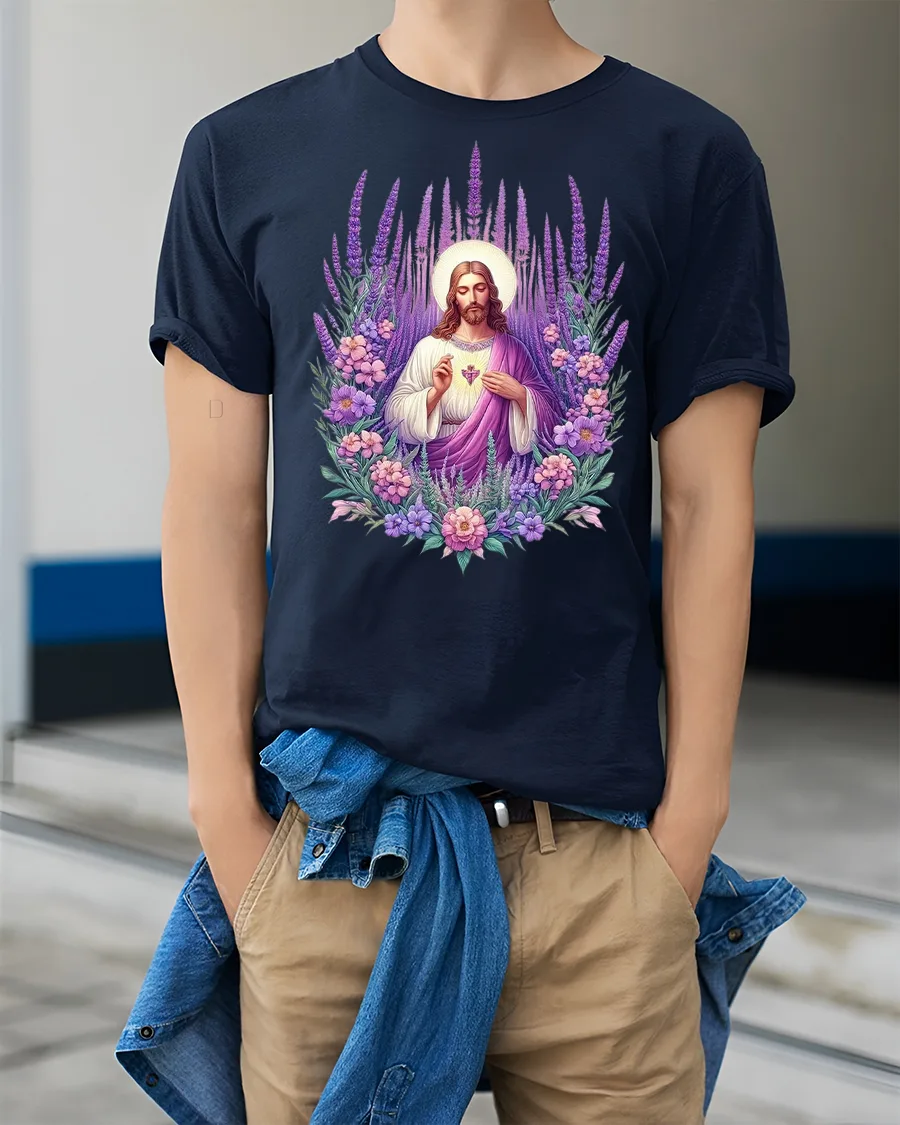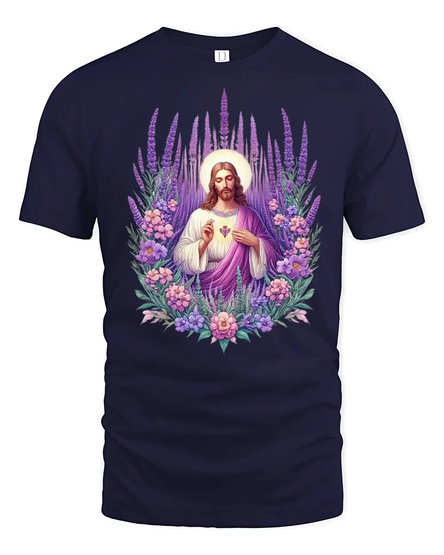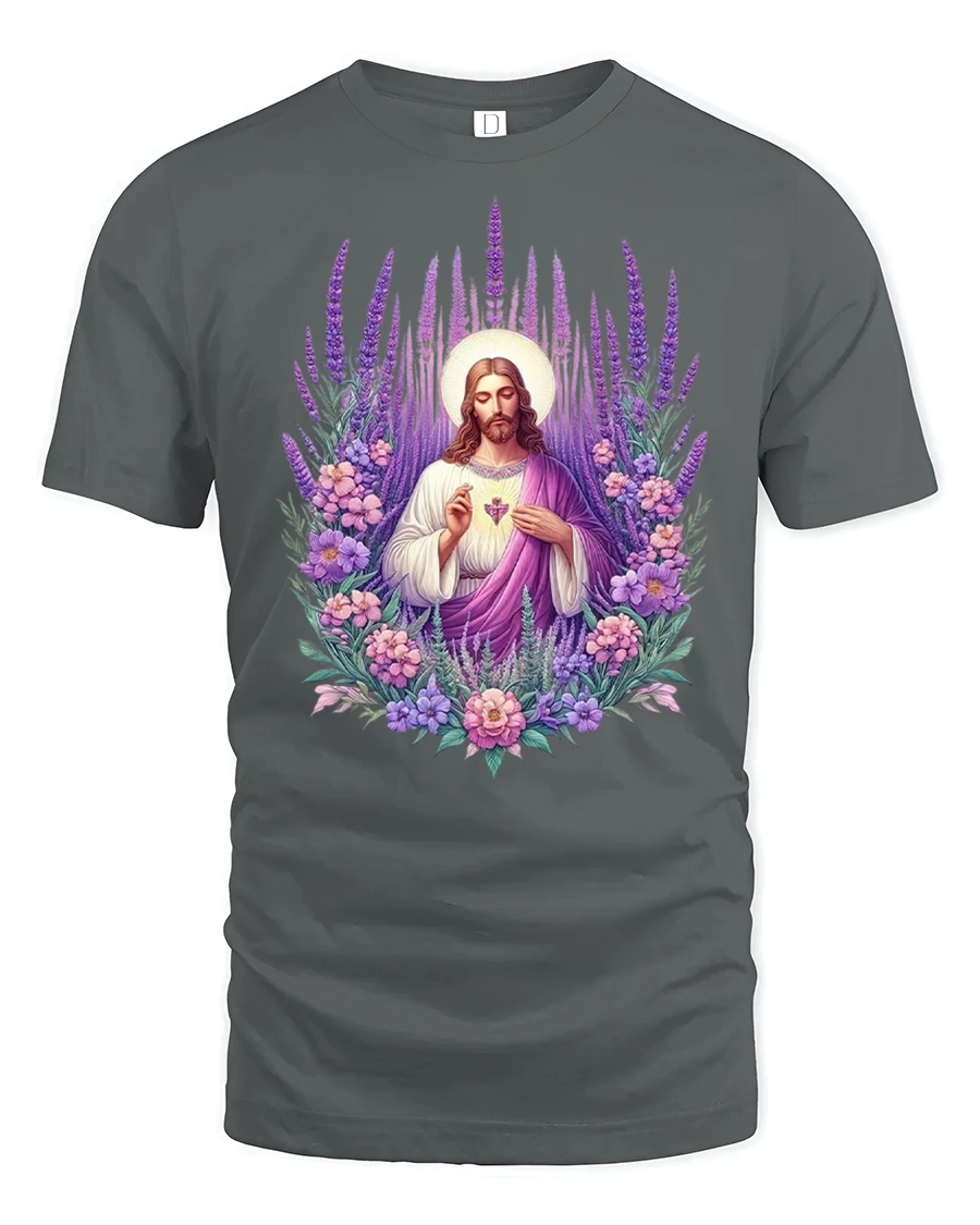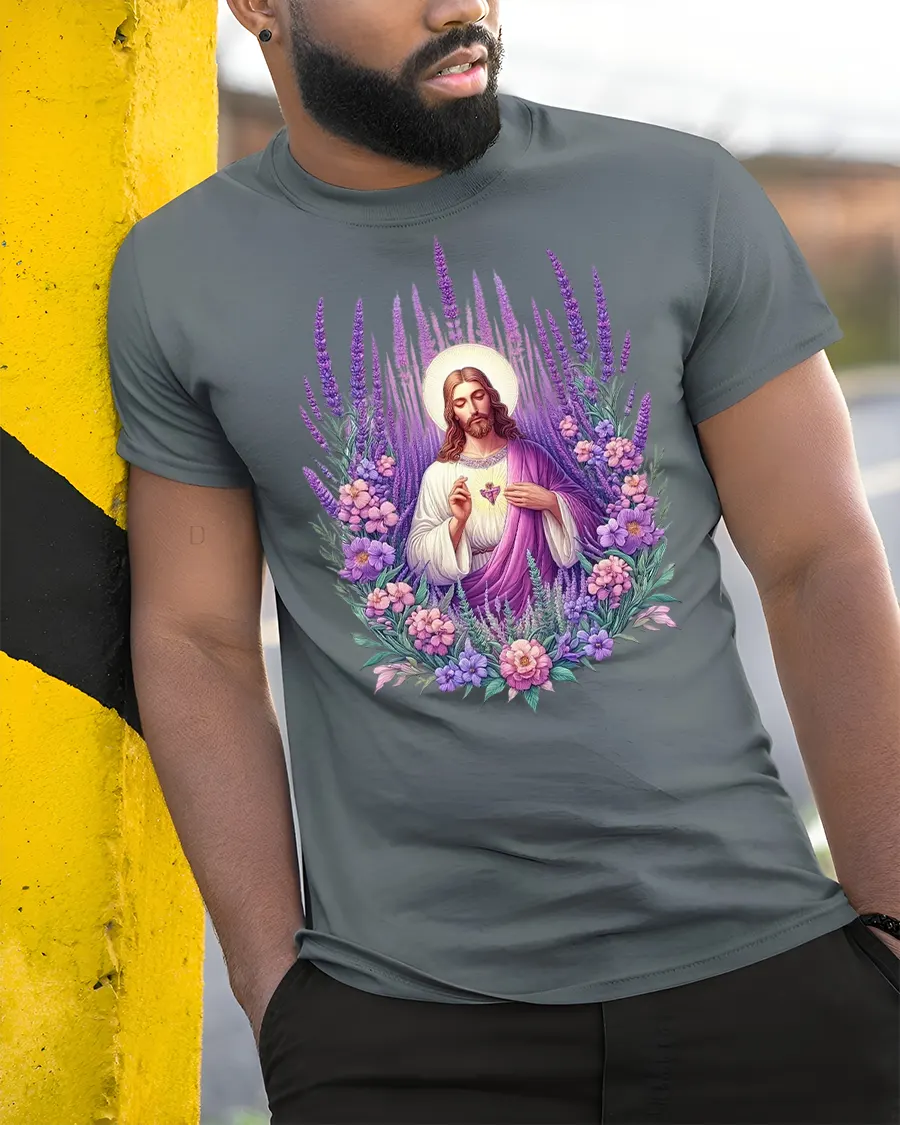 Featuring a stunning artwork of Jesus surrounded by soft lavender and floral details, this tee symbolizes love, peace, and devotion.