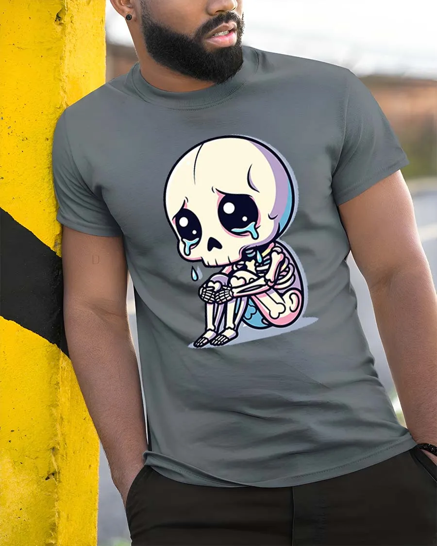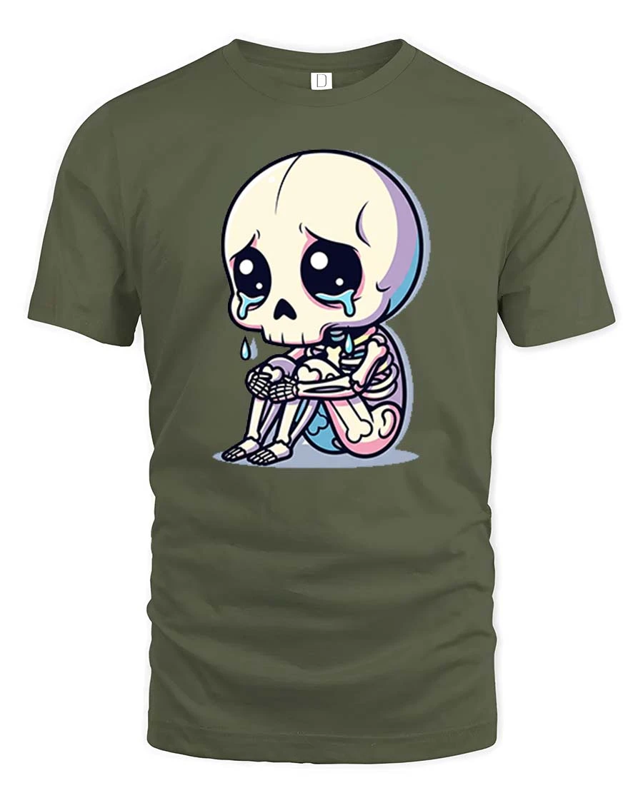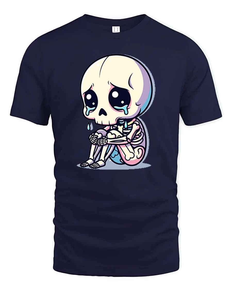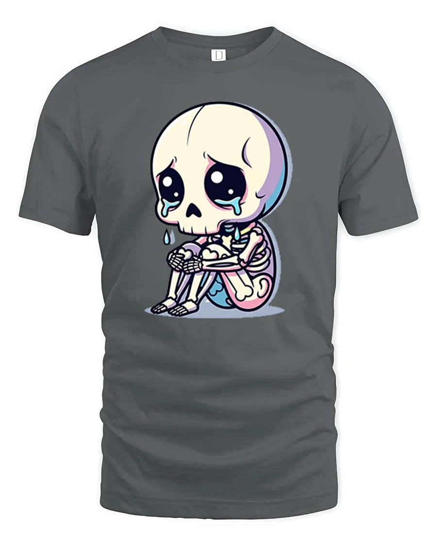 Featuring a teary-eyed skeleton sitting in a vulnerable pose, this t-shirt blends dark themes with a cute cartoon style.