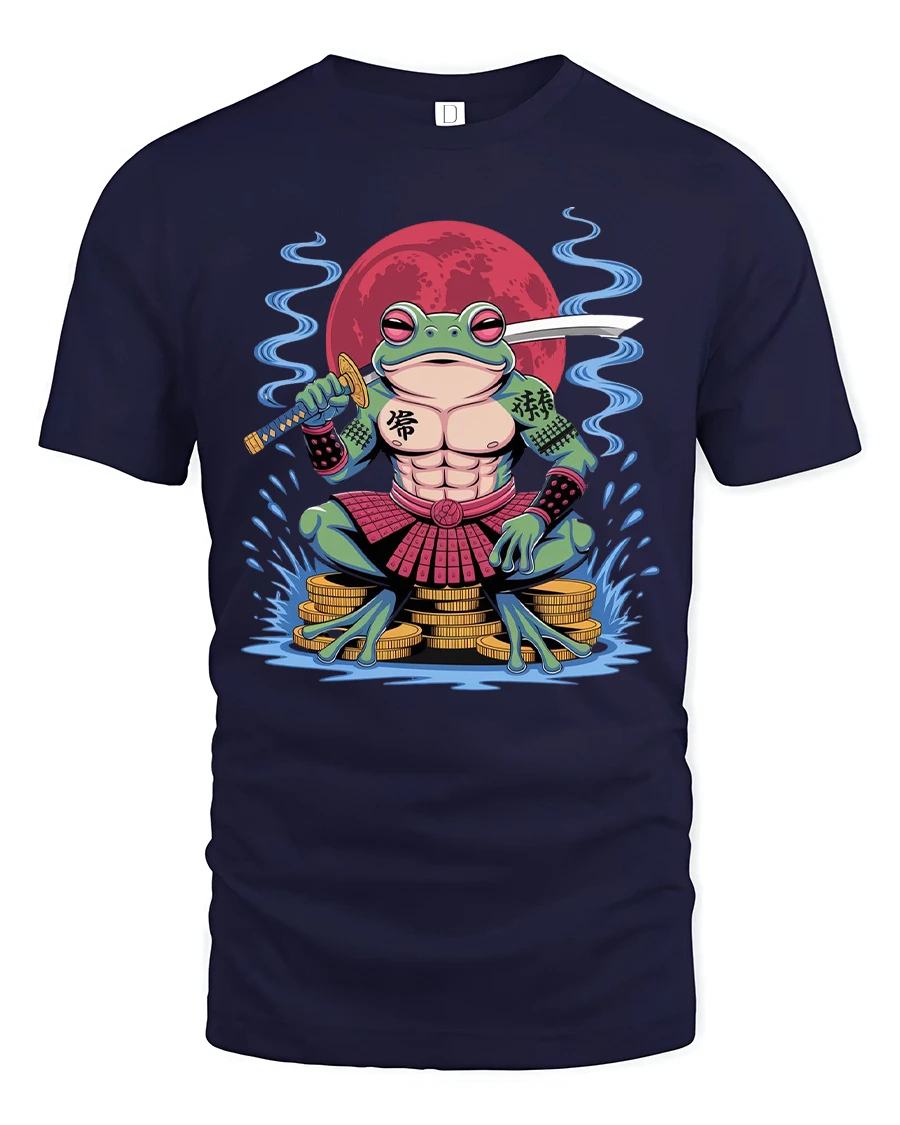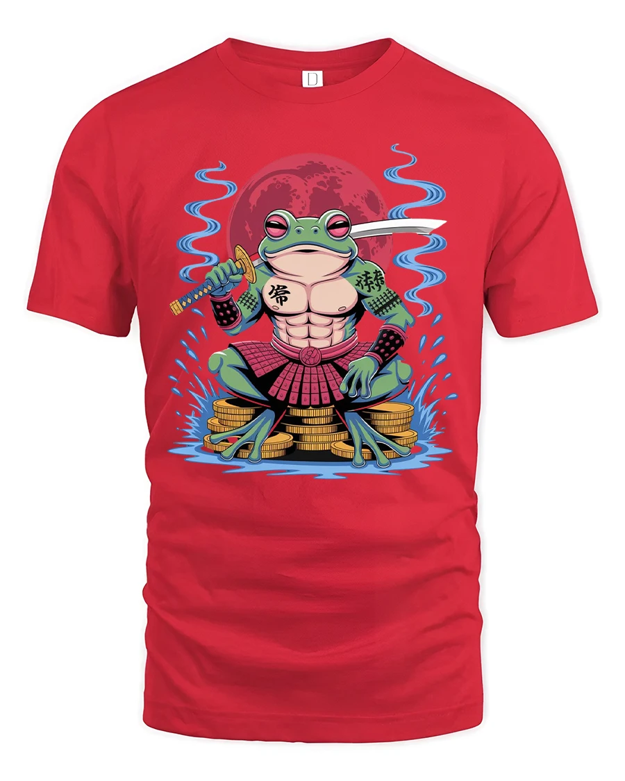 The samurai frog warrior graphic t shirt features a powerful frog character dressed as a fearless samurai holding a sword with confidence.
