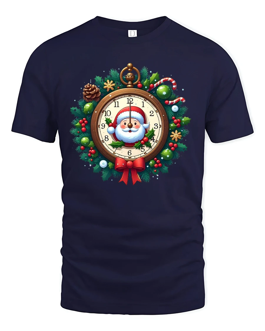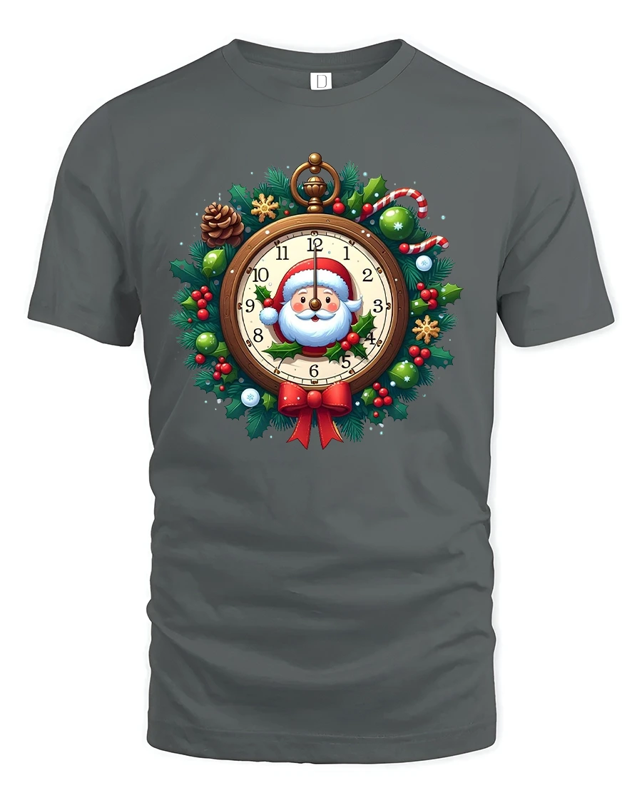Celebrate the magic of the holiday countdown with this santa clock t shirt featuring an adorable Santa Claus face inside a festive Christmas wreath clock design.