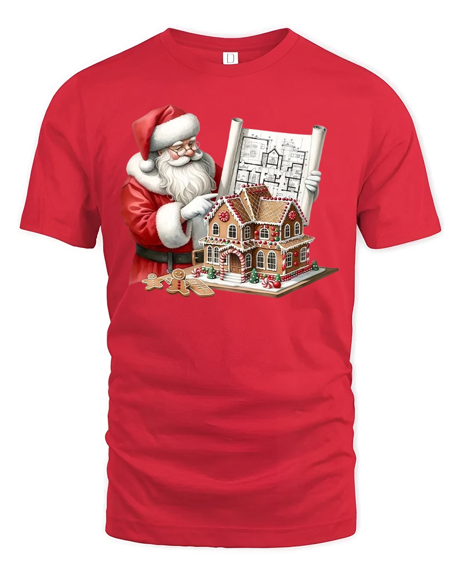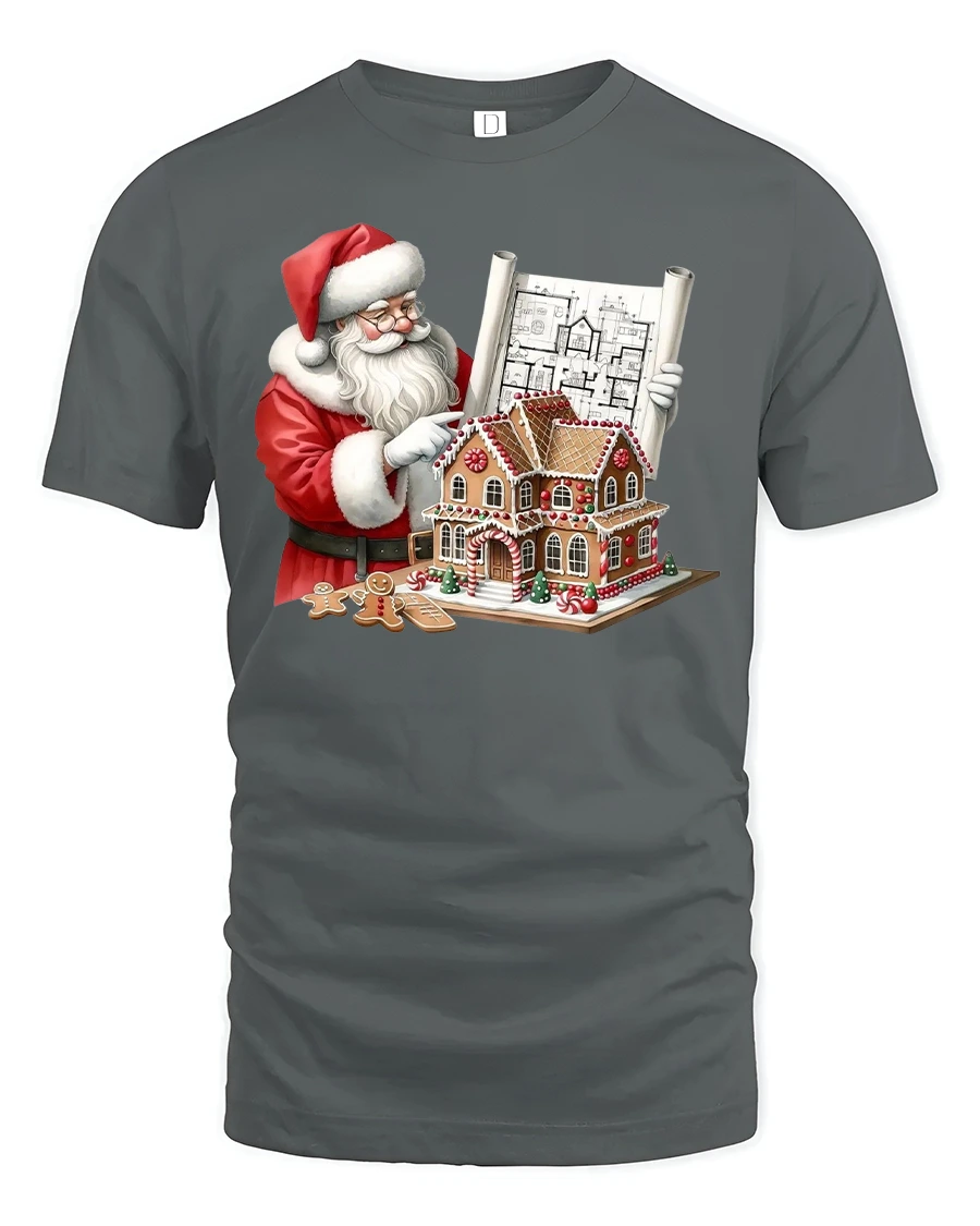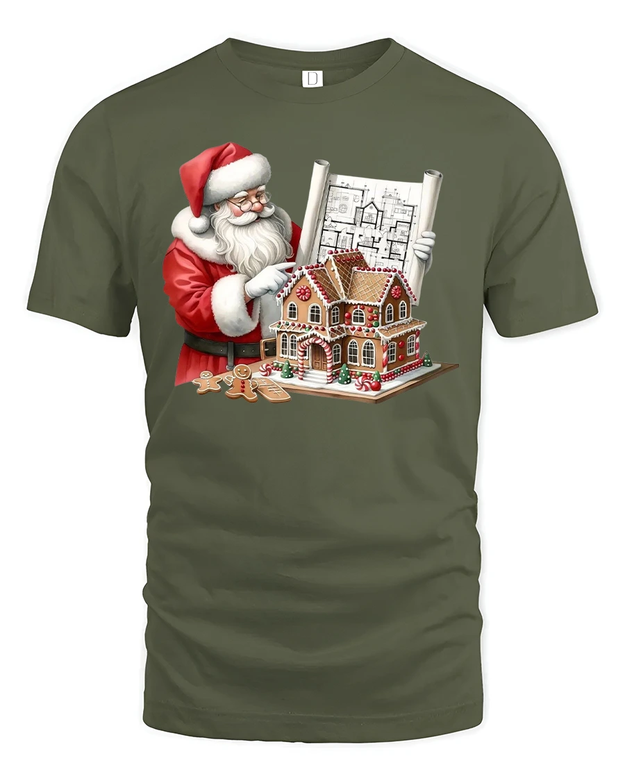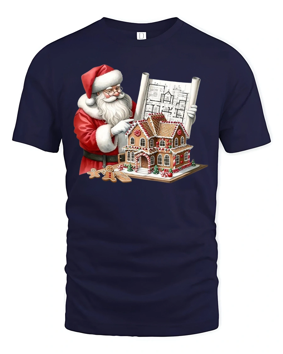 Santa Gingerbread Architect Tee Funny Christmas Blueprint Tshirt brings festive creativity and delightful humor together in one charming holiday design. Featuring Santa Claus studying a full architectural blueprint while proudly presenting a perfectly crafted gingerbread house, this tee adds a clever twist to the magic of Christmas preparation. Detailed cookies, candy accents, and holiday décor complete the whimsical scene, making it perfect for gingerbread lovers and Christmas enthusiasts alike.