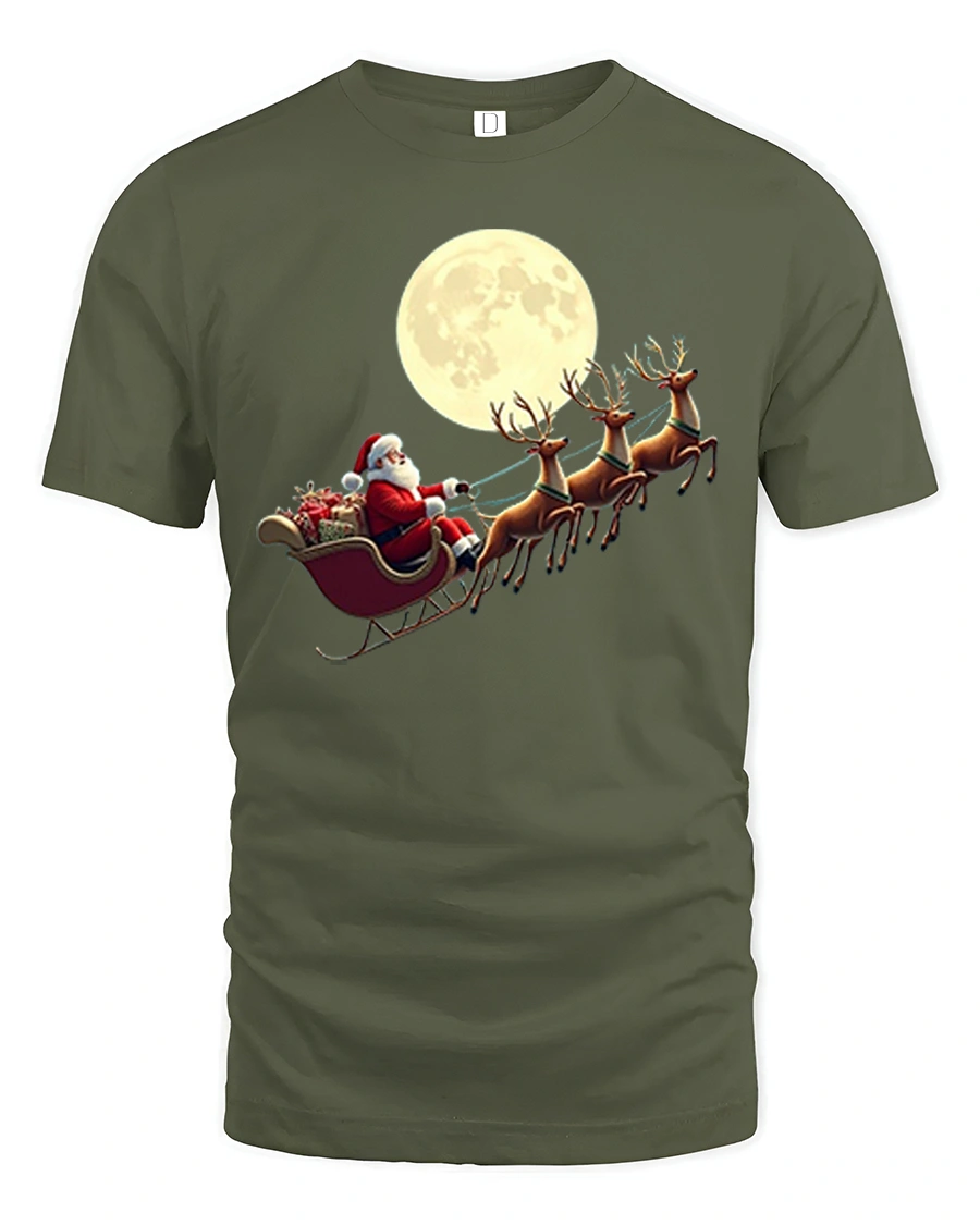 The Santa Sleigh Moonlight Ride Classic Christmas Graphic T-Shirt captures the magic and nostalgia of a peaceful winter night. Featuring Santa soaring across the sky in his sleigh pulled by reindeer and illuminated by a glowing full moon this design brings the warmth and wonder of the holiday season to life. The detailed artwork creates a charming traditional Christmas scene that appeals to all ages.