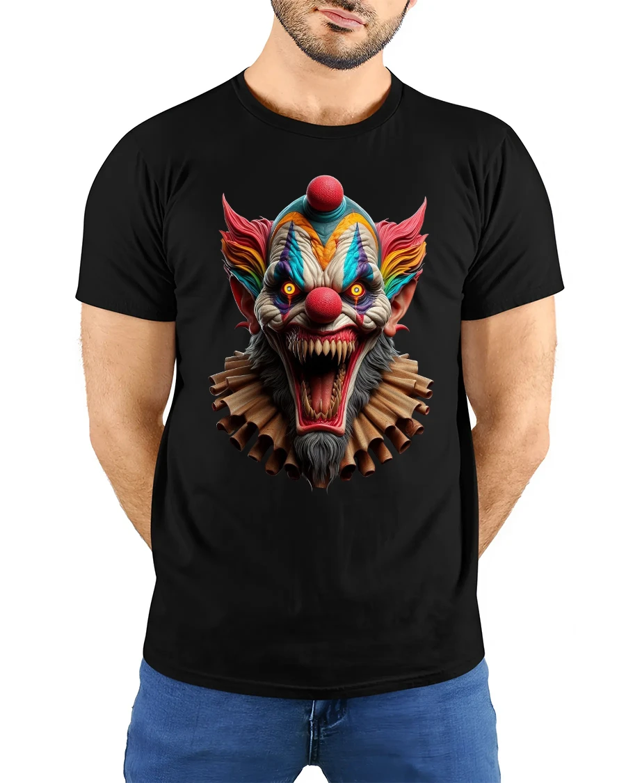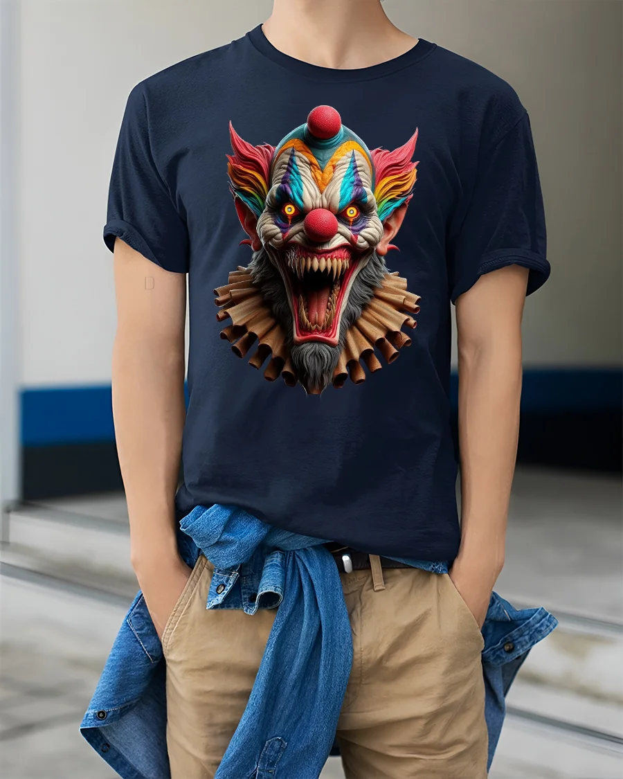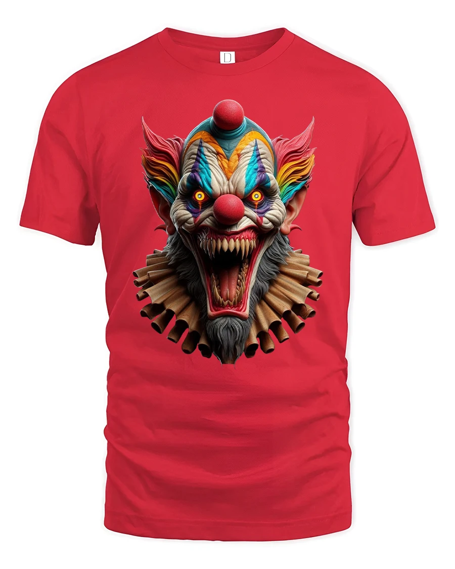 This Scary Evil Clown Horror Face Graphic T-Shirt Creepy Design delivers an intense and spine-chilling look that stands out boldly. Featuring a terrifying clown with sharp teeth, glowing eyes and exaggerated facial paint, the artwork captures the raw fear and dark energy associated with classic horror themes. The vivid colors and detailed textures enhance the unsettling atmosphere, making this design perfect for horror fans who love bold and frightening visuals.