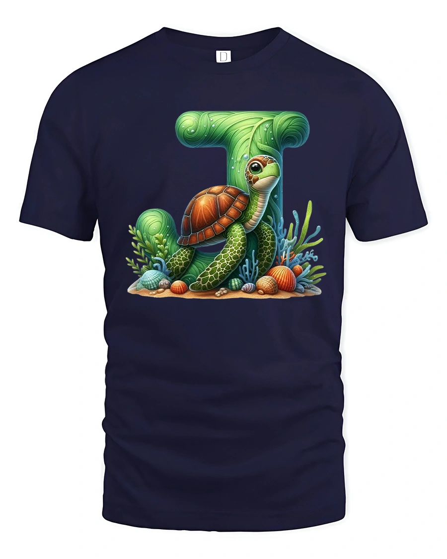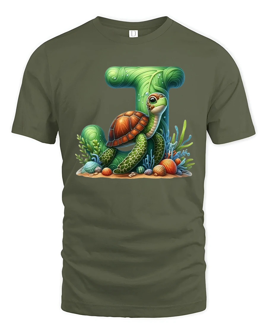Sea Turtle Letter T Ocean Inspired Illustration Graphic Tee features a charming sea turtle integrated beautifully into a bold letter T design.