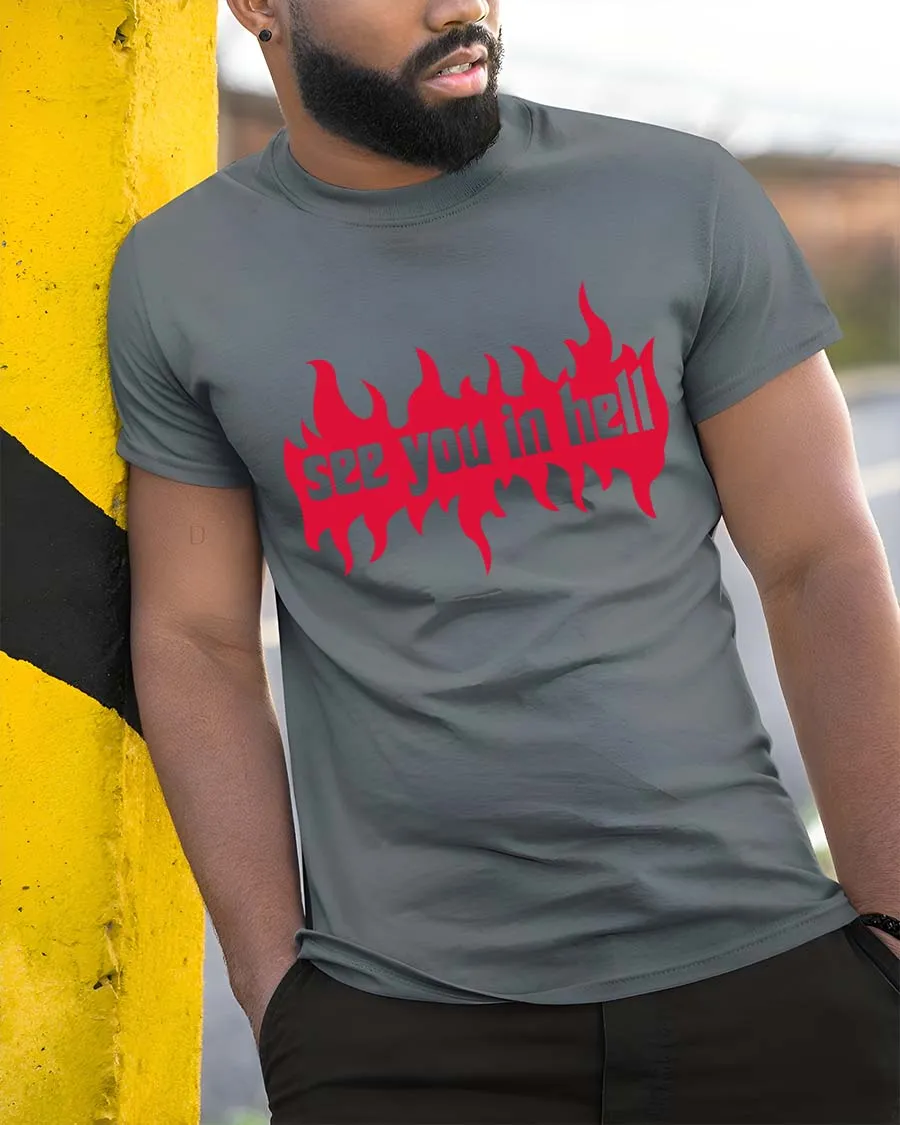 See You In Hell Flame Gothic Dark Graphic T Shirt features bold typography surrounded by dynamic flame elements that create a striking visual presence.