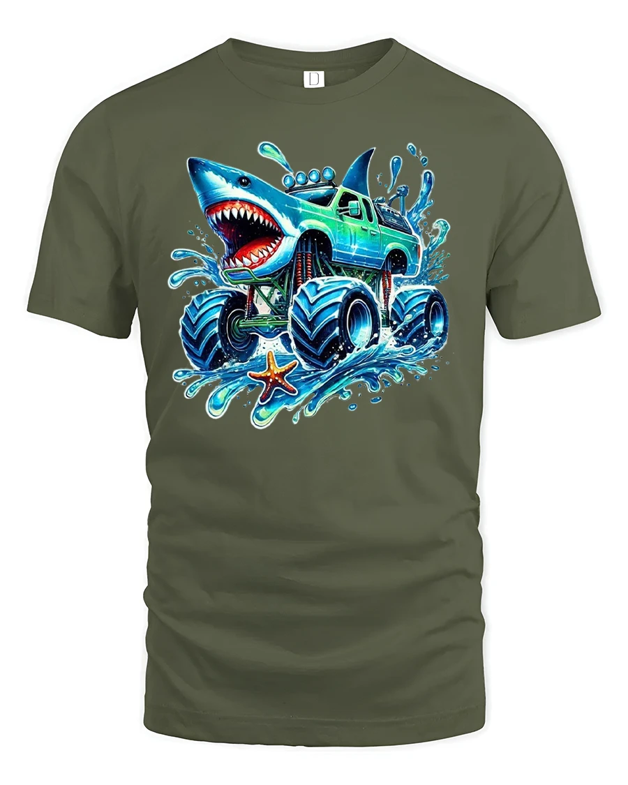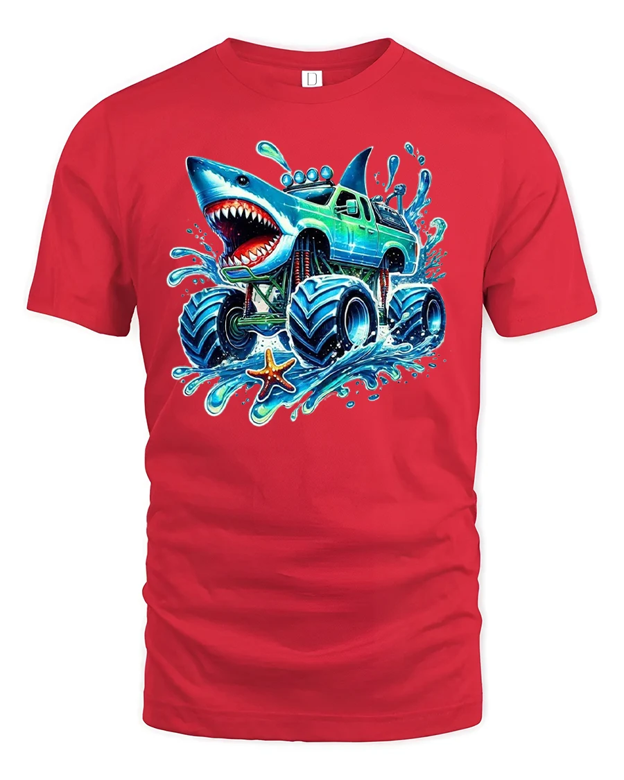 This eye-catching design features a roaring monster truck with a fierce shark head splashing through waves, perfect for kids and adults who love both sharks and big wheels.