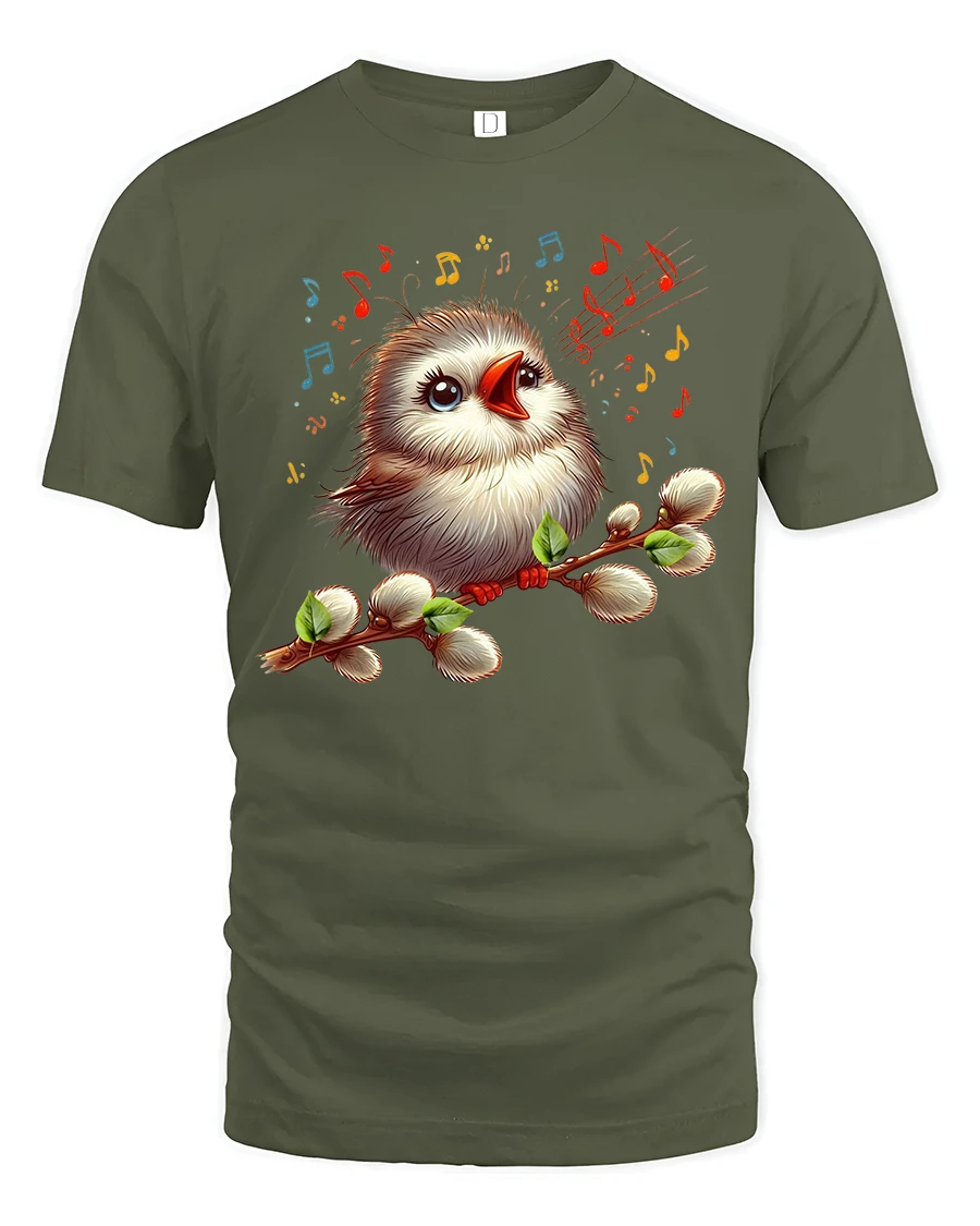 This singing bird t shirt features a charming little bird perched on a branch surrounded by floating music notes.