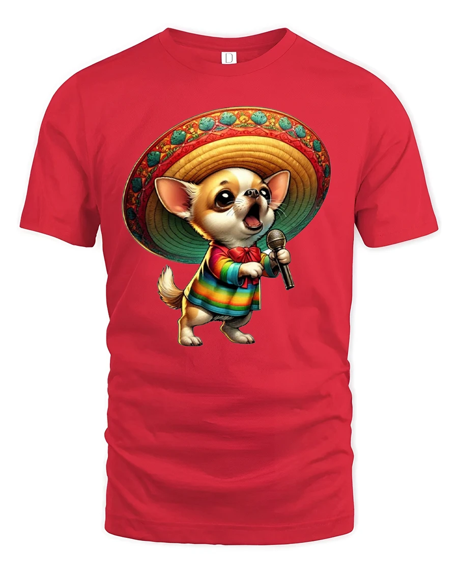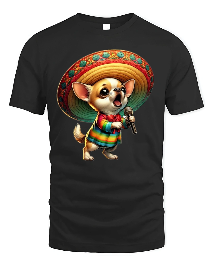 Featuring an adorable chihuahua dressed in a colorful poncho and sombrero, holding a microphone like a true mariachi star, this design is full of energy and charm.