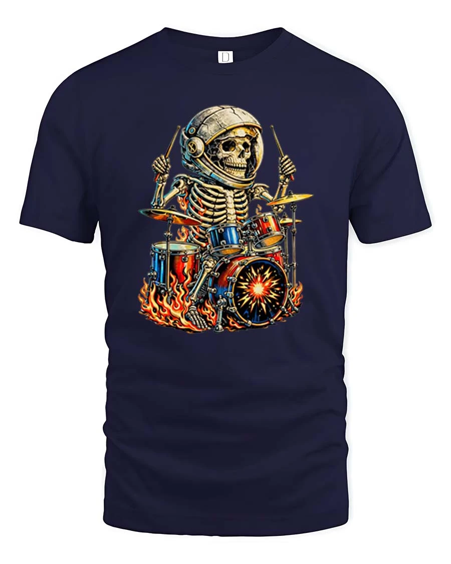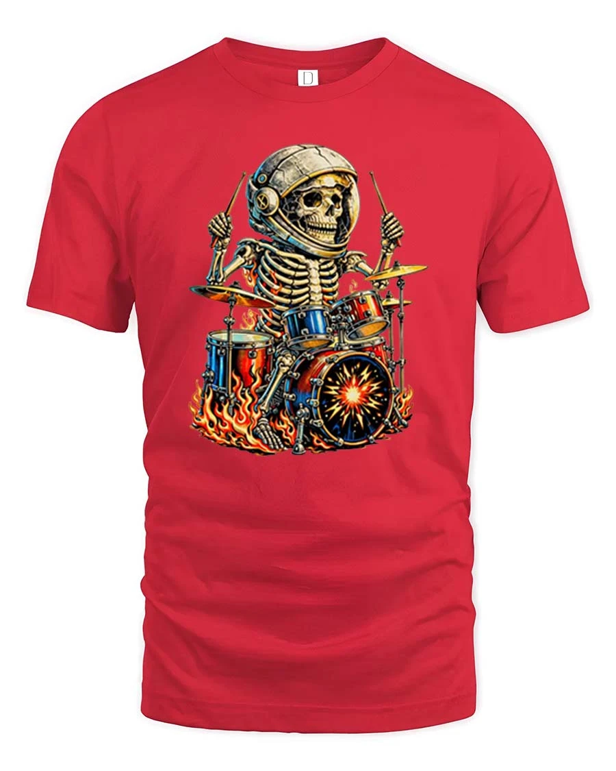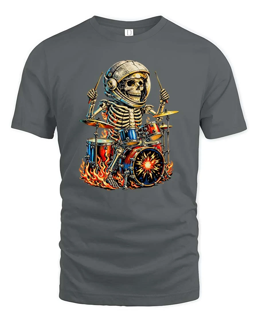 Skeleton Astronaut Drummer Fire Rock Music Graphic T Shirt features an energetic design that blends rock music attitude with imaginative space inspired art.