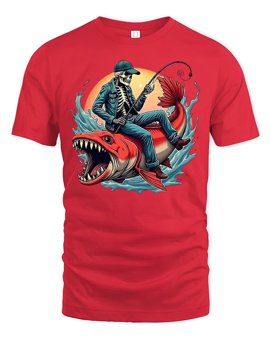 Skeleton Fisherman Riding Monster Fish Tee - red t-shirt on white background