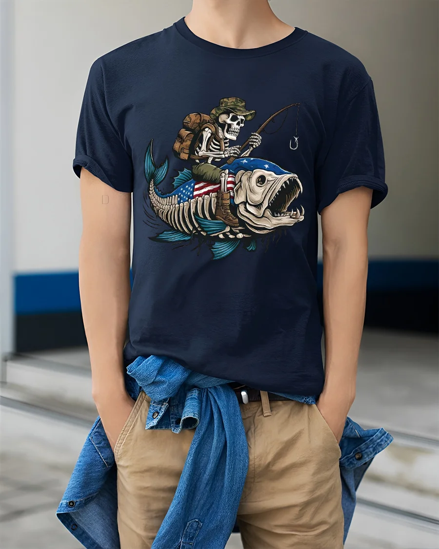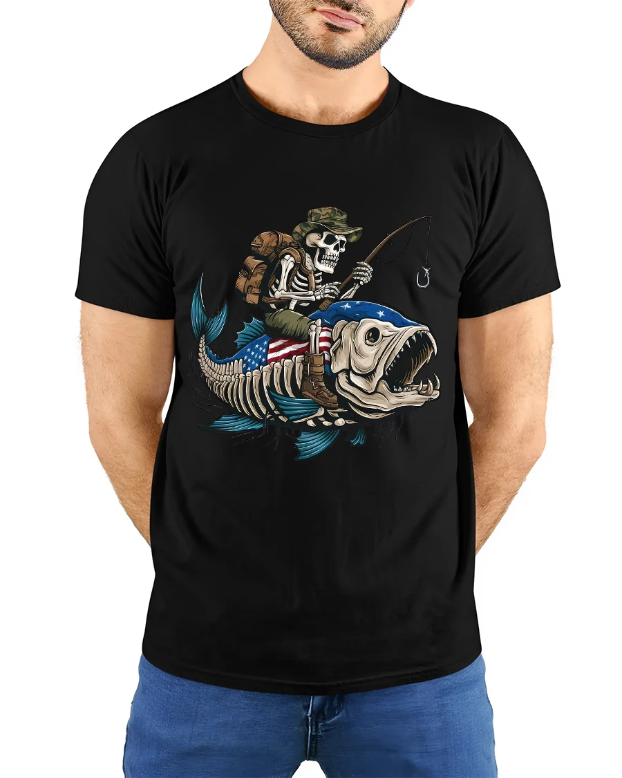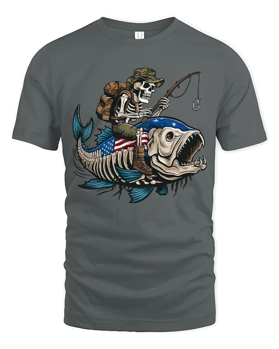 Skeleton Fishing Riding Giant Fish Graphic Tee With Dark Humor is perfect for those who love fishing jokes bold graphics and unconventional art.