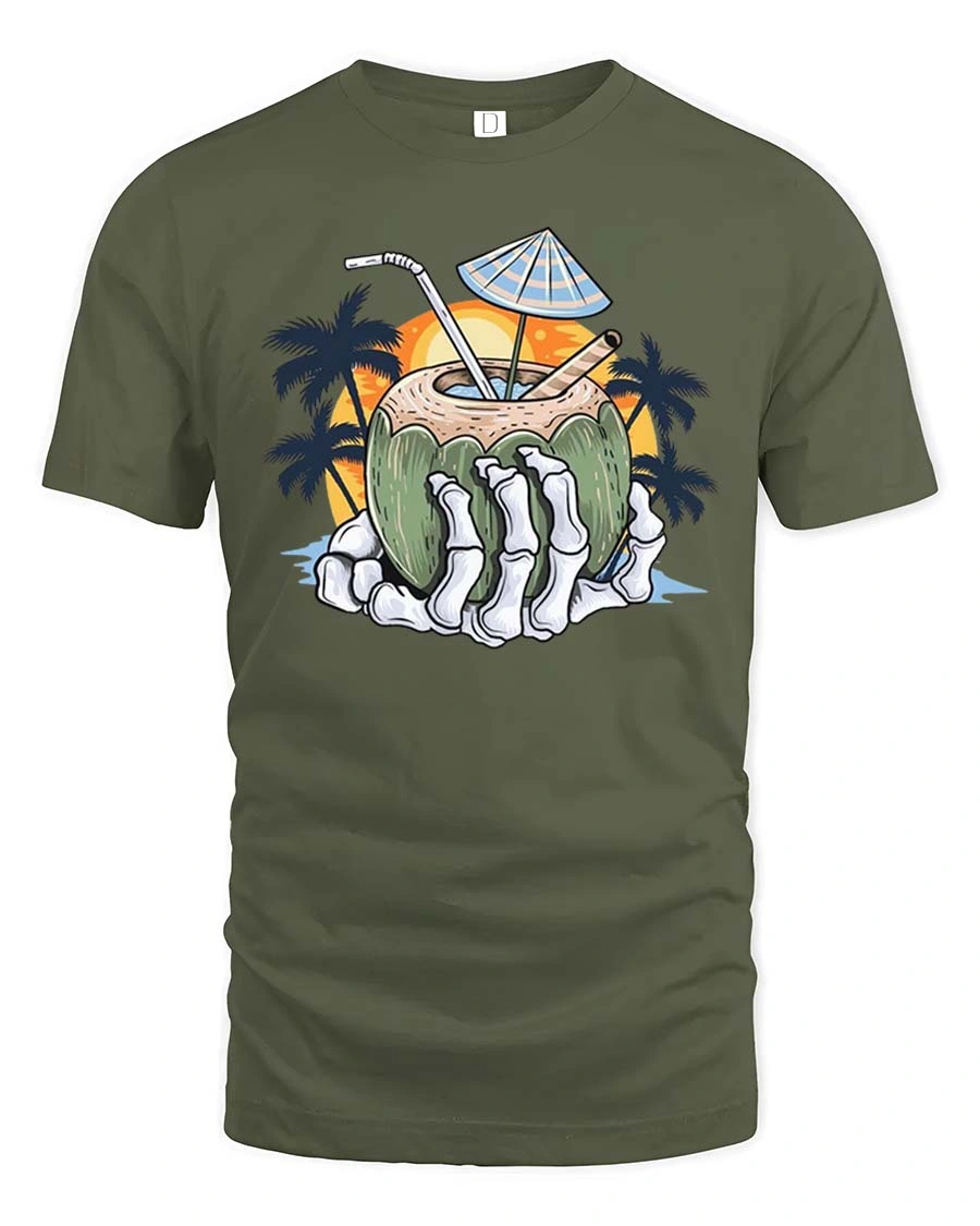 The Skeleton Hand Coconut Drink Graphic T-Shirt Tropical Beach Tee features a creative and fun design that blends spooky style with tropical vacation vibes.