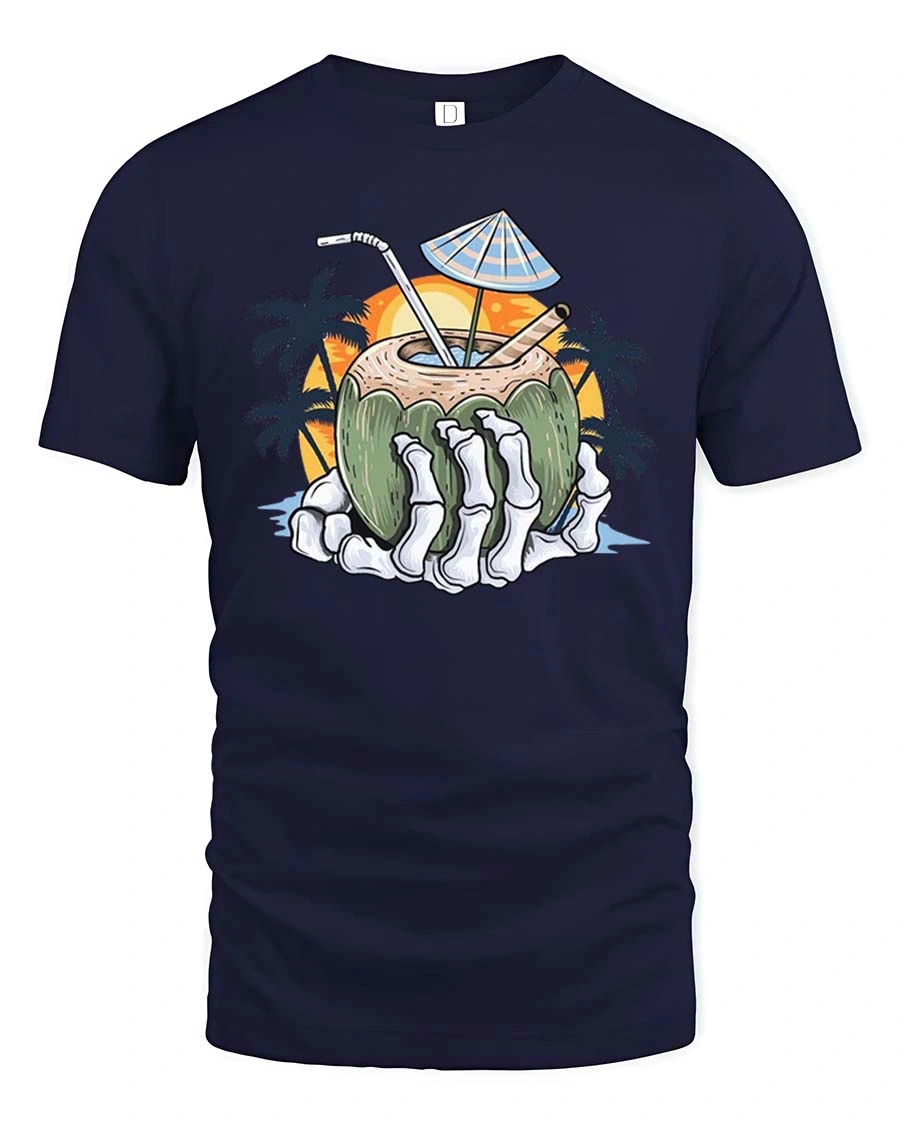 This skeleton coconut t-shirt mixes humor with tropical style, making it perfect for beach lovers who enjoy a playful twist.