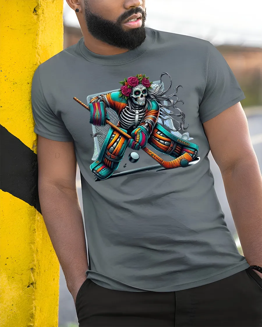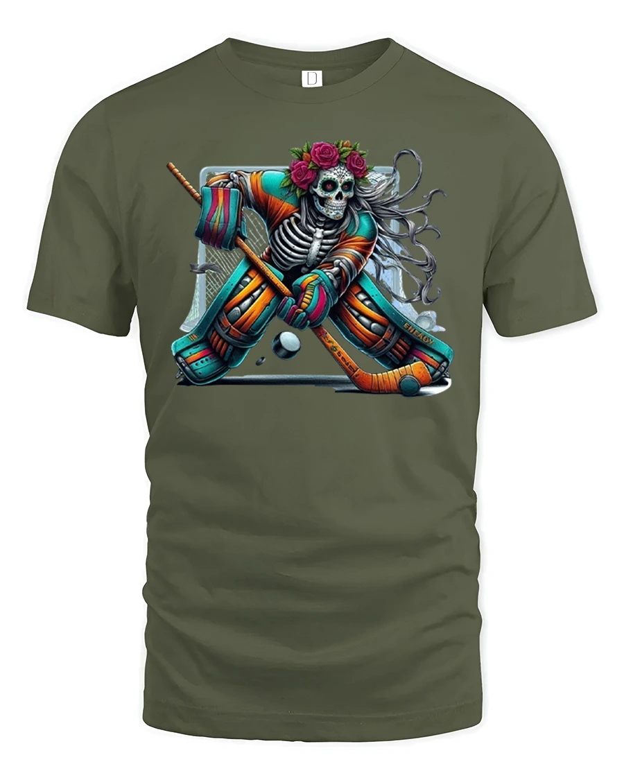 Perfect for Halloween, hockey lovers, or anyone who enjoys cool and creative art — this skeleton goalie tee scores a win in every style game.