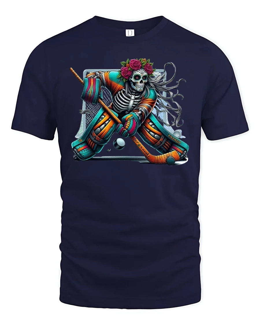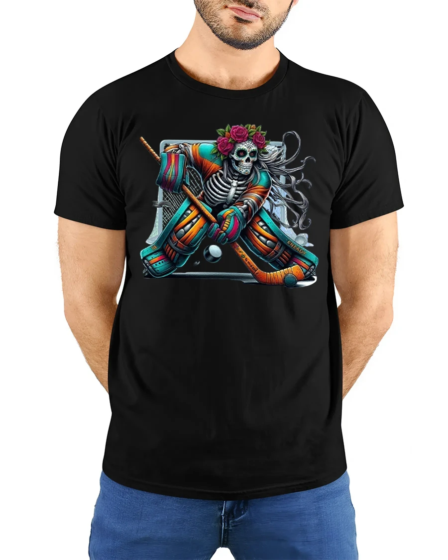 Show off your love for hockey and humor with this Skeleton Hockey Goalie Day of Dead Graphic T-Shirt, a bold and colorful design that blends sport and style.