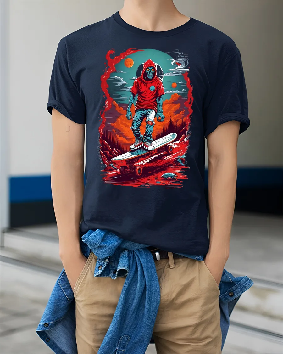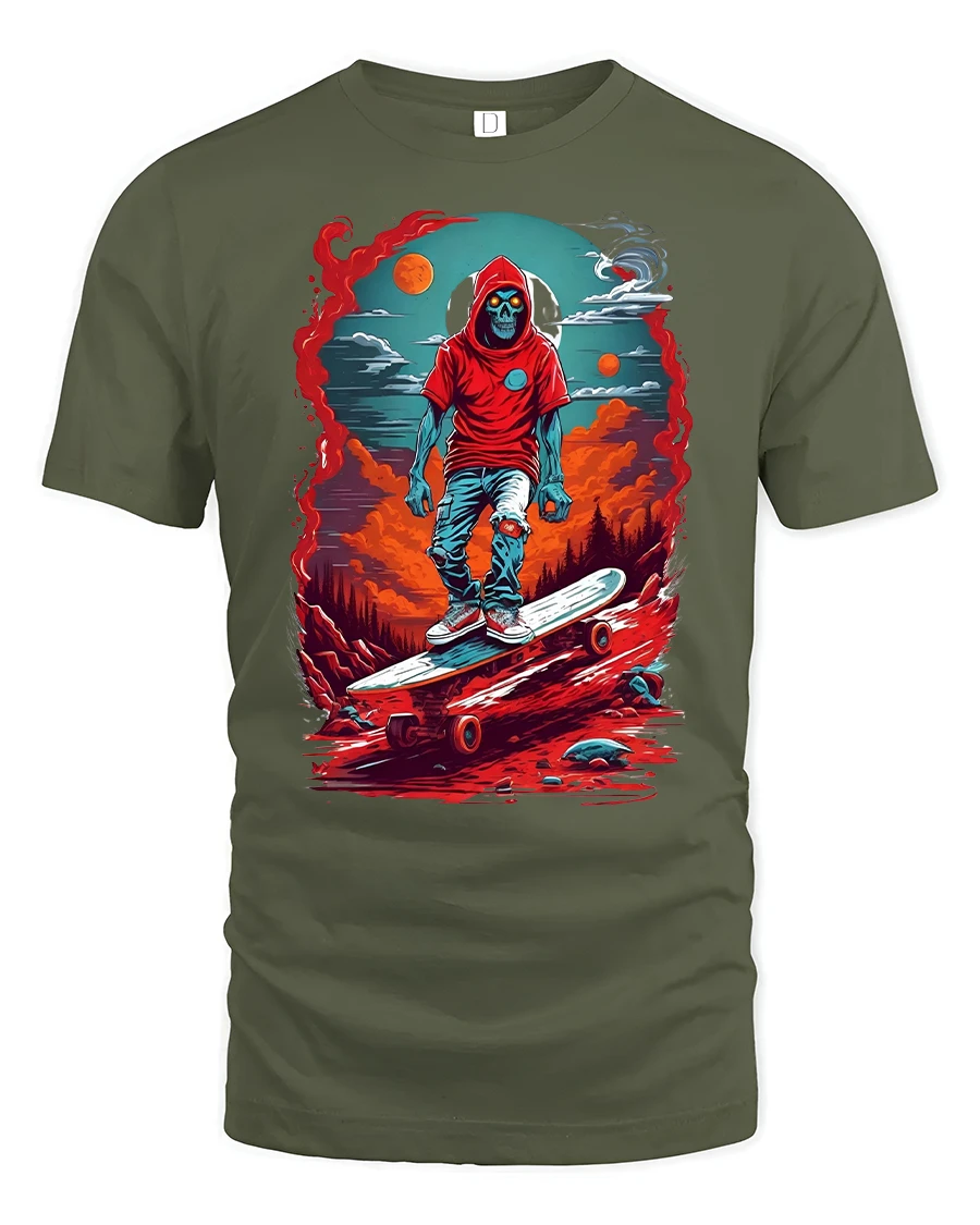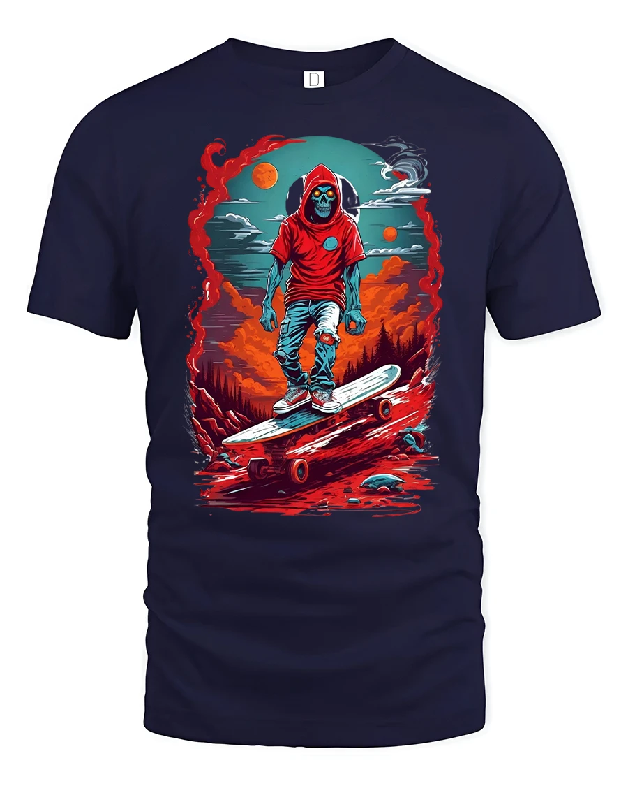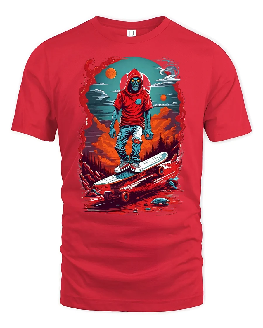 Skeleton Skater Hoodie Cool Skateboard Graphic T-shirt is the ultimate fusion of streetwear attitude and bold gothic art. Featuring a skeleton in a red hoodie skating through a fiery, surreal cosmic background, this tee is designed for anyone who lives for the thrill of skateboarding and edgy style. With vivid red, orange, and blue tones, it brings a striking street look that turns heads anywhere you go.