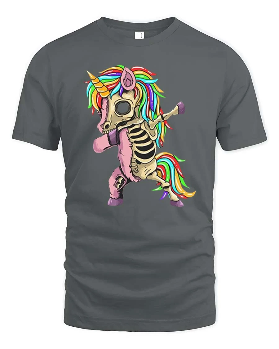 Featuring a unique skeleton unicorn with a colorful rainbow mane striking a fun pose, this t-shirt creates a standout look full of personality.