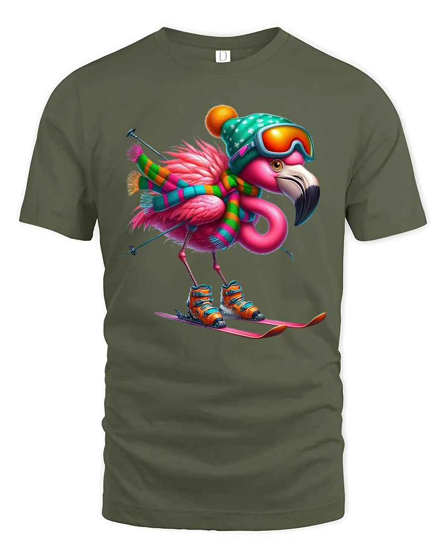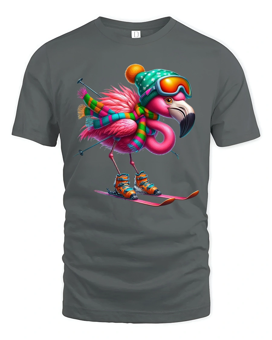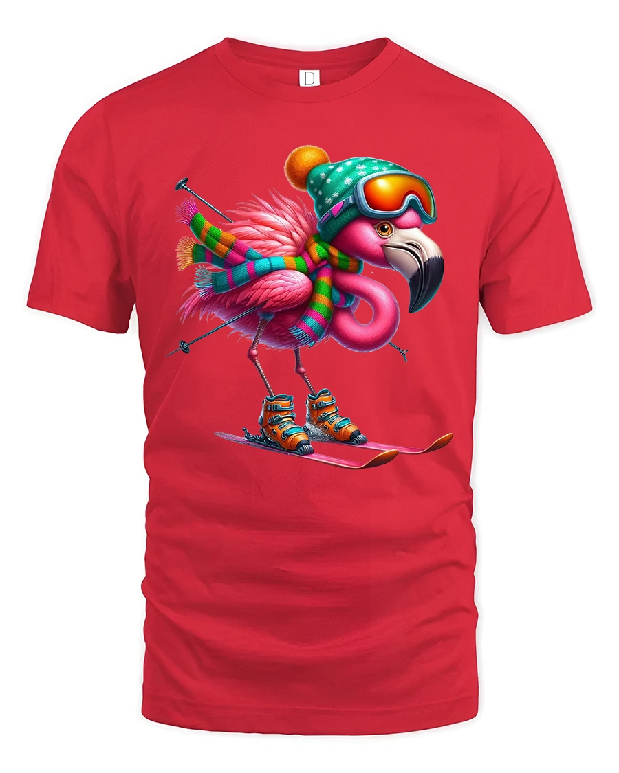 Skiing Flamingo Art T Shirt celebrates individuality fun and lighthearted winter vibes through expressive visual design.
